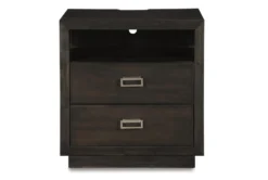 Made of wood, mango wood, and engineered wood. Dark espresso brown finish with wire-brushed texture. 2 smooth-gliding drawers and open cubby. Top drawer has felt lining. Bright nickel-tone hardware. Contemporary plinth base. 2 electrical outlets and usb charging ports.