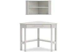 Clean contemporary styling. Combination small space corner desk with wall hanging bookshelf finished in white. Desk is designed to fit in a corner to make the most of a small space. Desk has a wide center drawer for storing smaller office essentials. The matching bookcase has two open shelves and easily mounts to the wall above the desk to form a convenient workstation.
