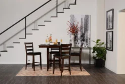 Sit high and mighty on a set meant for optimum counter dining. Not only will you relish this elevated experience, you�ll delight in the exceptional price. Decked in a dark espresso finish, these designs are crafted of hardwood and veneer. The lofty table features a square shelf where you can store entertaining essentials, and the accompanying stools boast sleek ladder backs and upholstered seats.