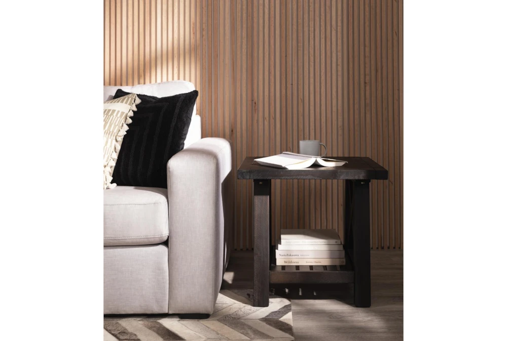 Thanks to 100% solid pine construction, the items in our Jaxon occasional collection are truly designed by nature. The wood’s character plays a central role in the authenticity and rustic charm of each piece, from the rugged texture, to the knots, nicks, splits and imperfections that ensure they’re one-of-a-kind. Decked in a dark cafe finish and distinguished by metal bolt detail, this end table features cross-braced legs and a slatted bottom shelf for displaying additional books, magazines and decorative accessories.