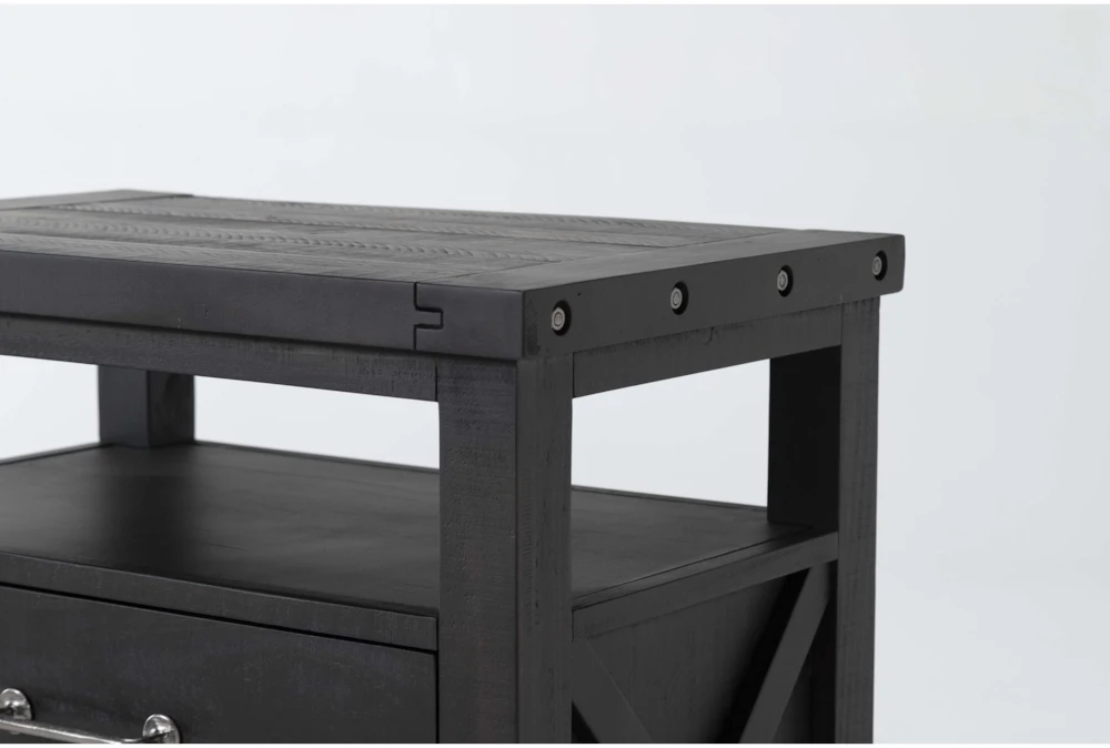 Thanks to 100% solid pine construction, the items in our Jaxon bedroom collection are truly designed by nature. The wood’s character plays a central role in the authenticity and rustic charm of this piece, from the rugged texture, to the knots, nicks, splits and imperfections that ensure it is one-of-a-kind. Decked in a dark cafe finish and distinguished by metal bolt details, the nightstand also boasts hammered pewter pulls and USB ports.