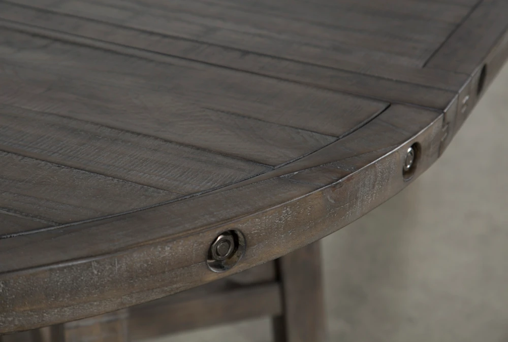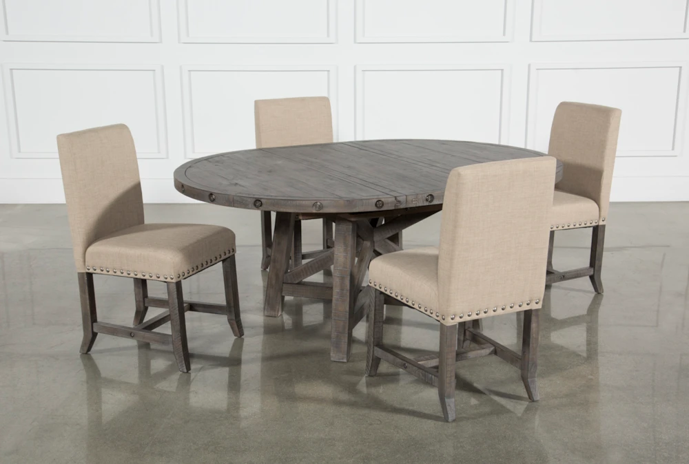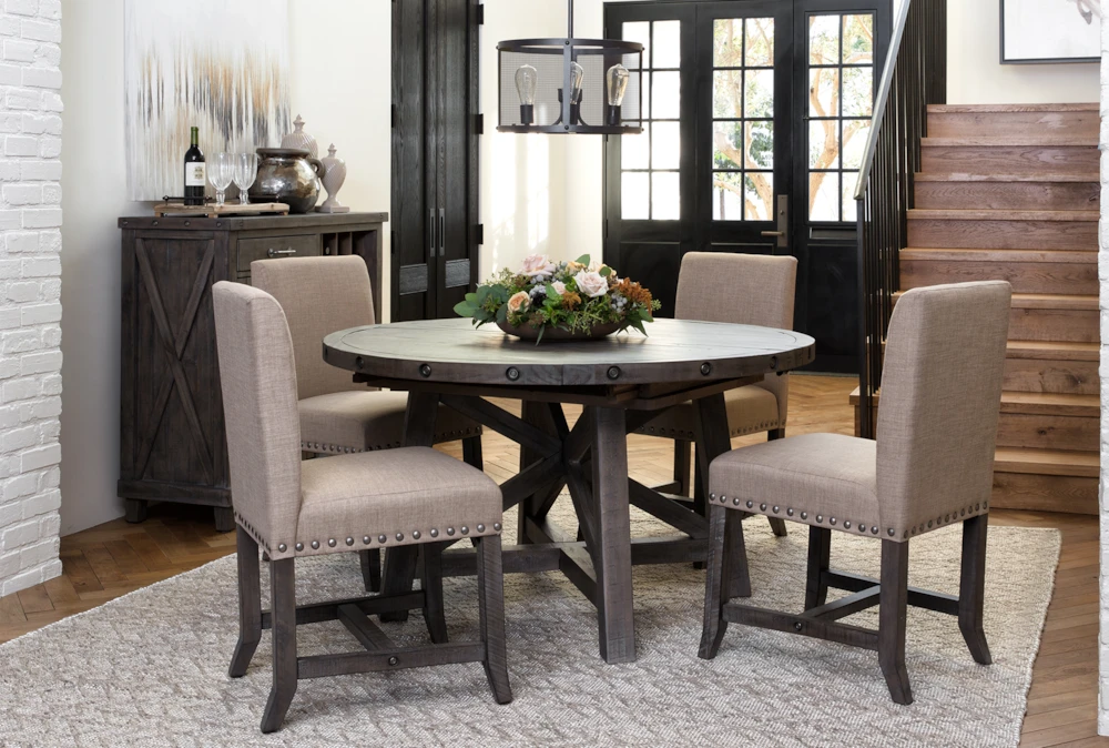 The Jaxon Grey 5-piece dining collection � which includes a round extension table and 4 upholstered side chairs � allows you to enjoy one of our most popular rustic styles in a brand new grey finish. Distinguished by all natural 100% solid pine construction, these designs offer fresh color, unique texture and rugged character that will enrich your meals. The round dining table features a bold pedestal base, metal bolt detail and an 18� extension leaf, so you can expand your guest list. The upholstered chair features durable fabric and nailhead trim.