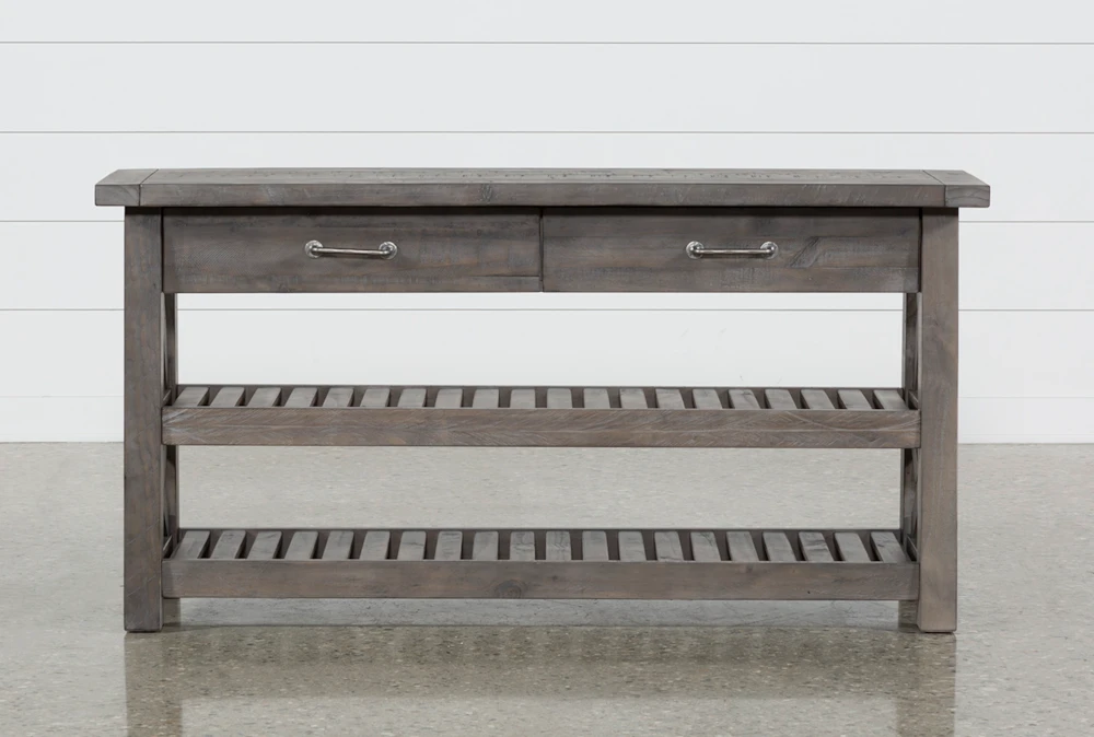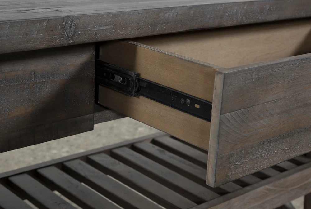 Our Jaxon Grey sofa table updates one of our most popular rustic styles with a new finish and new features. Distinguished by all natural solid pine construction, it brings fresh color, unique texture and convenient functionality to your living room. The design includes 2 drawers for storing accessories and 2 slat shelves for displaying magazines, books and accents.