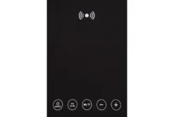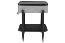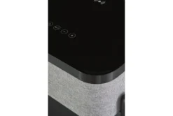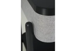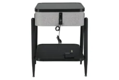Made with solid and engineered wood and metal. Black finish on metal and wood, Glass top. Gray polyester fabric on sides. Table top with wireless charging and touch button controls. 6.5″ full range speaker and 2″ tweeter speaker. Wireless connection. Fm Antenna. Aux input. USB CHarging port. Fixed shelf.