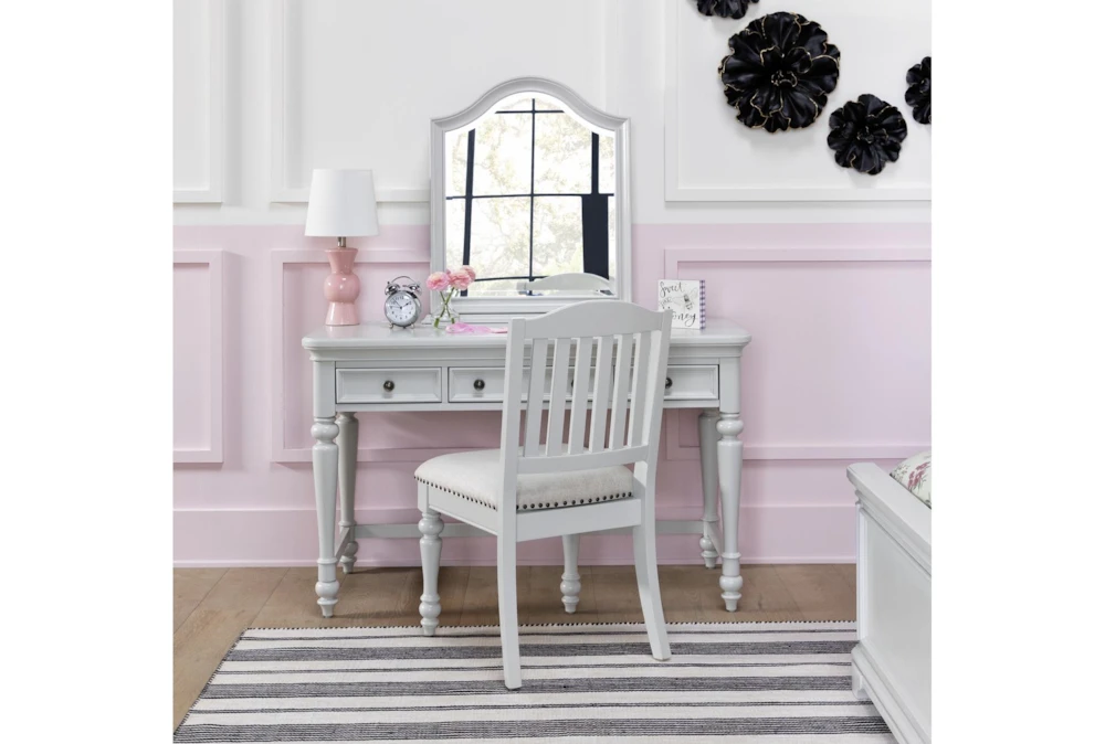 Our traditional yet youthful Julia desk chair will help transform your child’s bedroom into a space where they can blossom and evolve. Featuring elegant details and a soft grey finish, it’s just as suitable for young kids as it is for teens. Constructed to pair with the desk, it features graceful turned legs and a upholstered nailhead-trimmed seat.