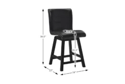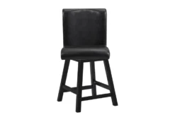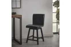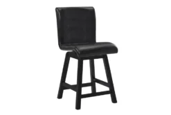 The Kirke Swivel Counter Height Chair Set Of 2 is a rustic style dining room furniture made of solid wood and faux leather with cushion and swivel features, and requires assembly.