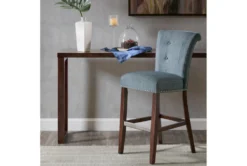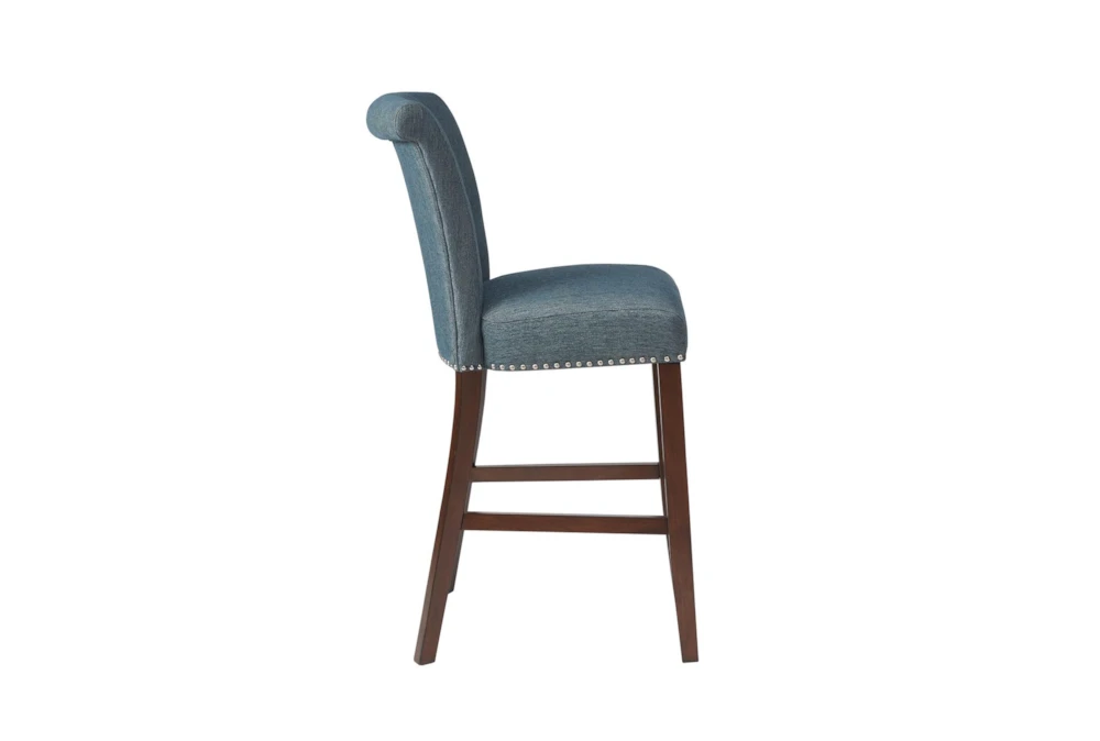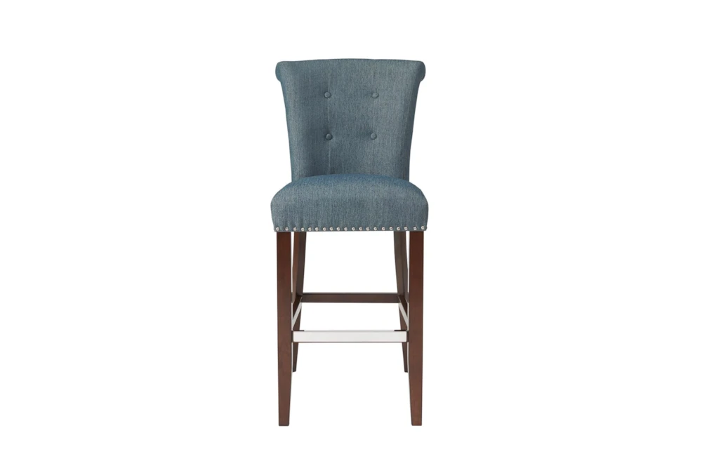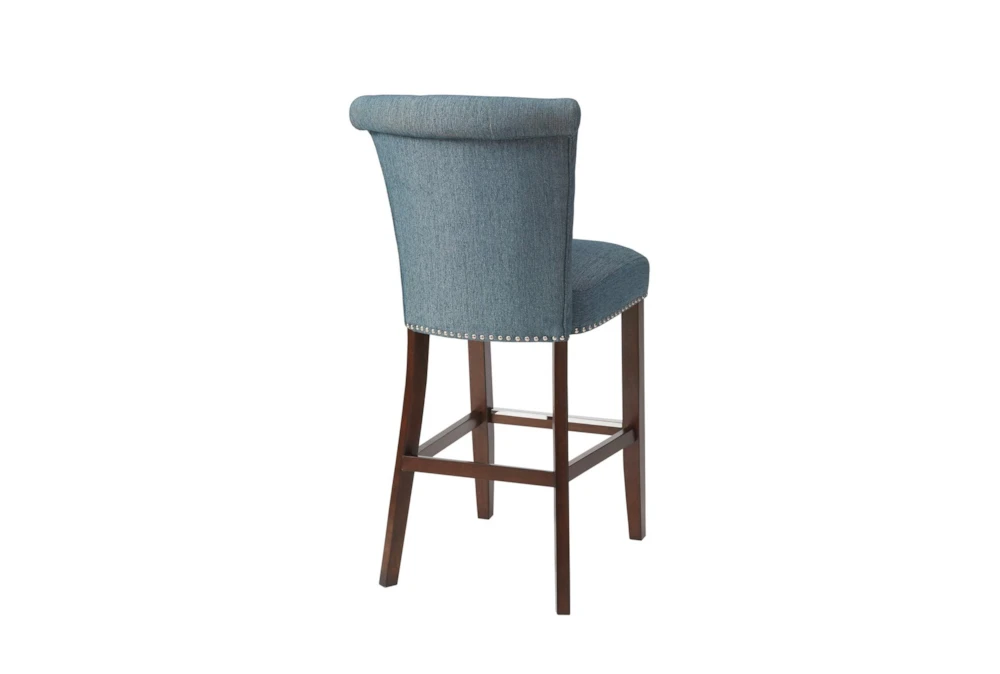 The Landon Blue 30″ Bar Stool features a traditional style with nailhead accents, a backrest, and a cushioned seat made from 100% polyester fabric and high-density foam filling. This Rubberwood and solid wood stool also includes an espresso wood finish, silver kickplate, and silver nailhead trim.