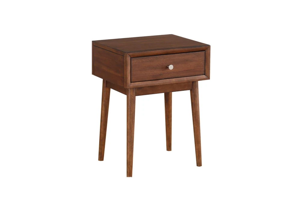 The Leslie End Table is a modern-style piece made of quality wood. It features storage and drawers, with a single dovetail drawer that has ball bearing glides and polished nickel tone knobs. Assembly is required for this brown-colored rubberwood table that will fit perfectly in any living room.