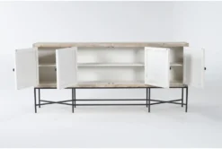Create a stylish hub of entertaining for your living room with our Lupe 90-” media console. Grand in design, this piece is chic and unique with a sleek metal foundation and distinctive cabinet compartment. The geometric door motifs, natural texture and whitewashed finish add modern appeal, while enclosed shelving ensures all of your equipment and accessories stay neatly hidden.