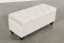 Add function and elegance to your bedroom with our Mariah storage bench. Designed to match our Mariah bed, it features a hand-tufted top and turned legs that bring on the traditional charm. In addition to 3 rear lid hinges for extra support, it includes 2 spring-loaded dampeners to ensure slow, safe closing. Whether you’re stowing away shoes and blankets, or taking a moment to sit and relax, you’ll love this piece.