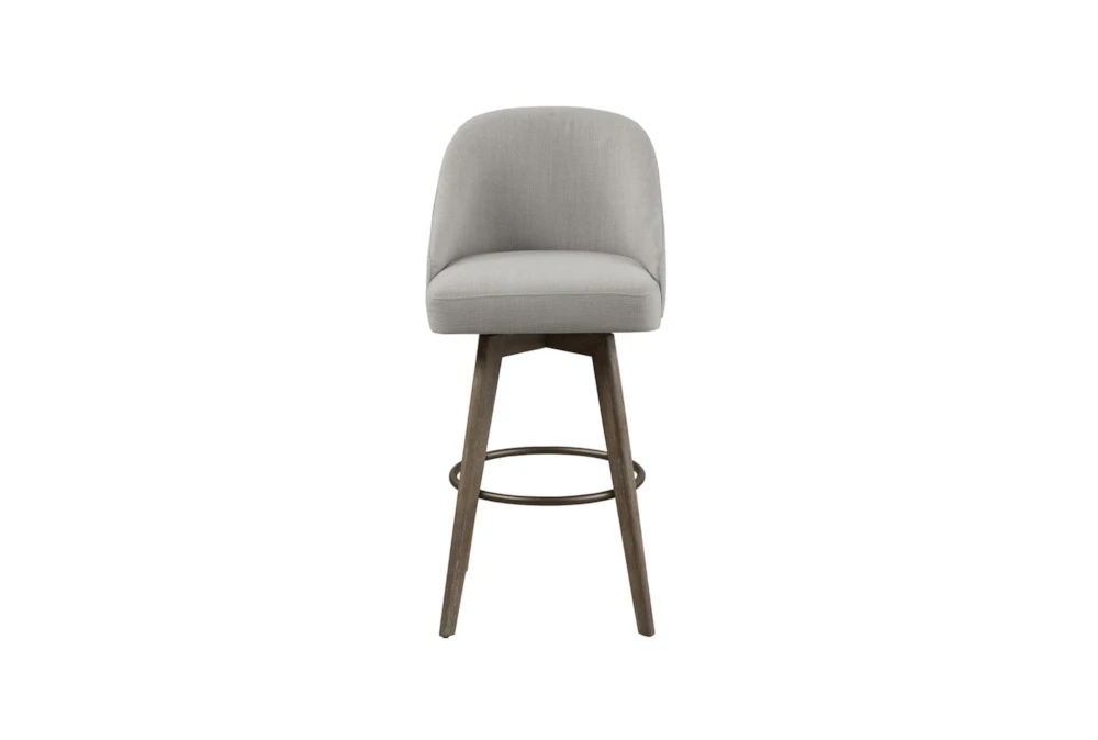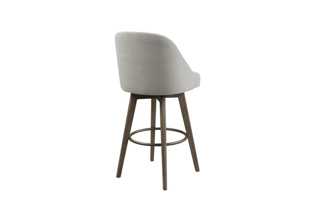 The Marshall Grey Bar Stool with Swivel Seat is a modern style stool made of solid wood and plywood frame, upholstered seat and back, and a matt silver metal ring footrest. Assembly is required, and the stool features sinuous springs for seat construction, a foam cushion and back fill material, and a 92% polyester and 8% linen fabric composition.