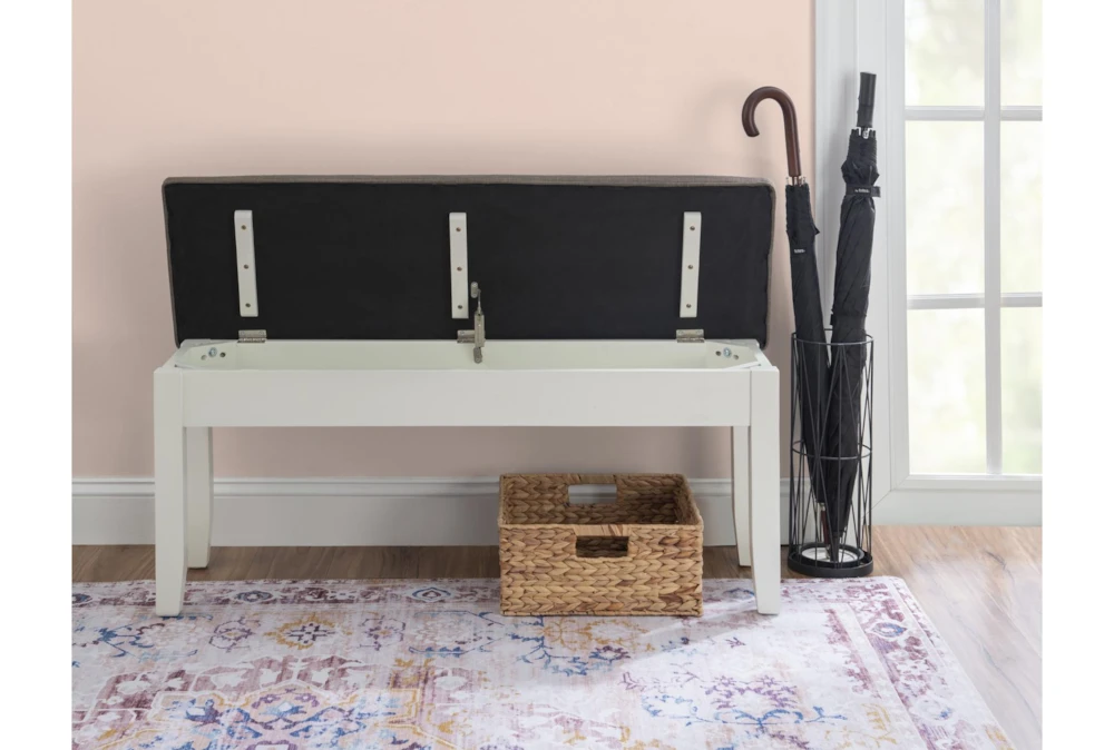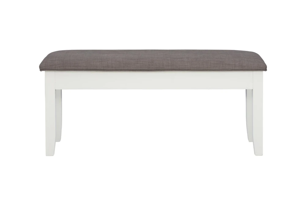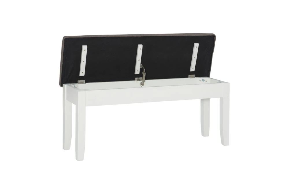 The Morgan Taupe Dining Storage Bench is a casual style bench made of wood and metal, featuring a white color and storage capabilities. The bench requires assembly and is made of 60% solid wood, 35% MDF, and 5% hardware.
