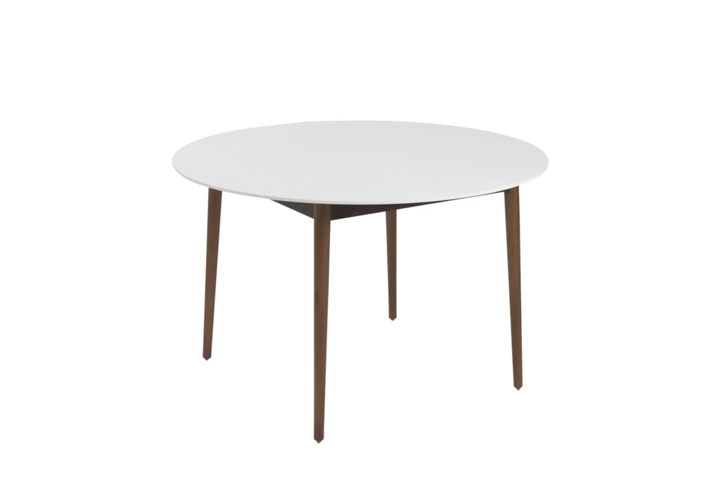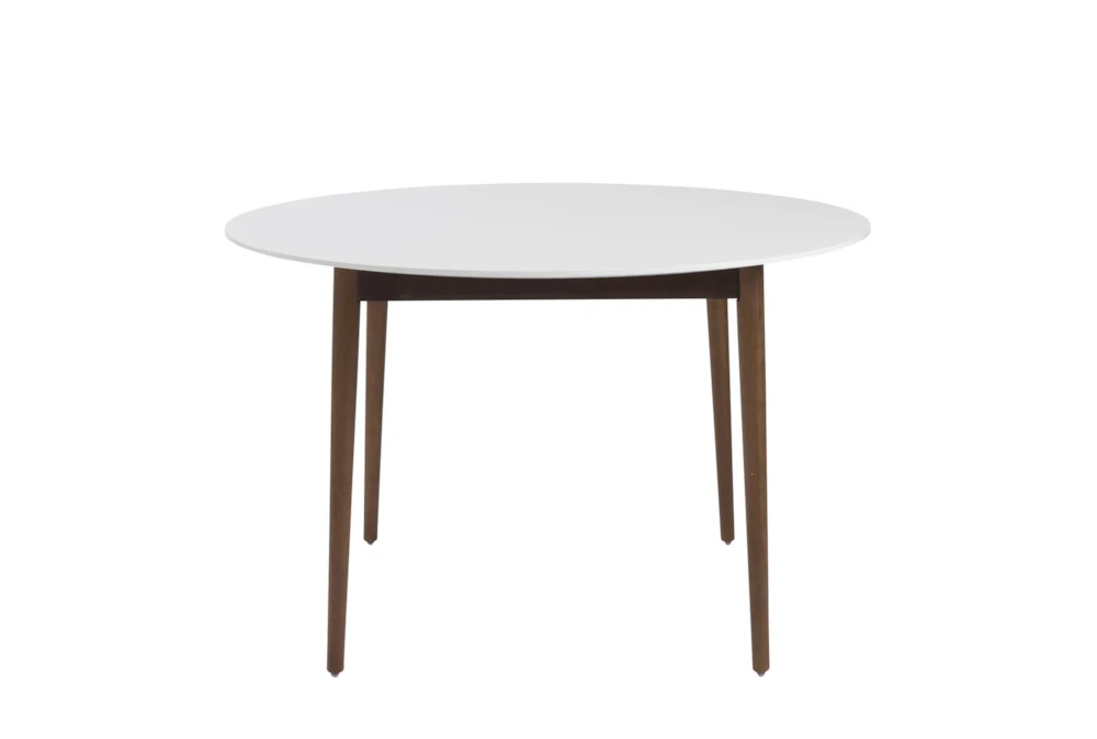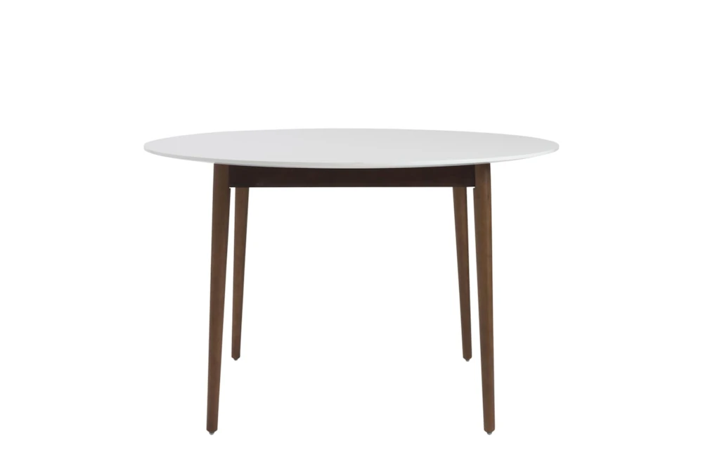 The Newport White 47 Inch Round Dining Table With Dark Walnut Base is a modern-style table made of lacquered MDF wood, designed specifically for dining rooms. Assembly is required to set up this white table with a dark walnut base.