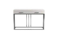 The Noelle Console Table is a contemporary style piece made with glossy white metal and wood, featuring two handy drawers for storage, perfect for organizing items in your living room. Assembly is required for this set which includes one (1) sofa table with overall dimensions of 47.25″ W x 15.75″ D x 31.75″ H.
