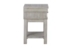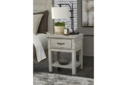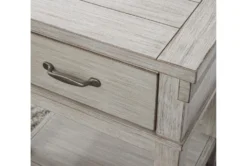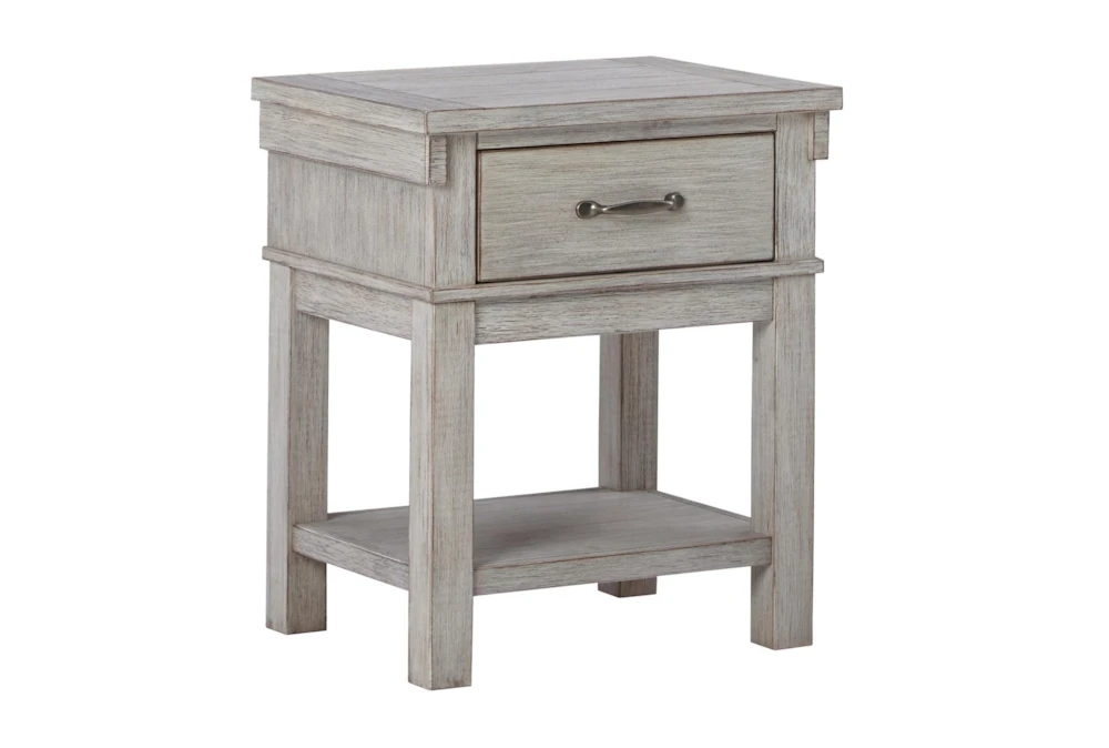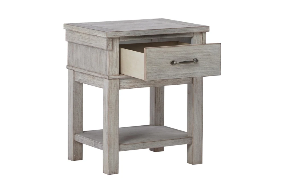 Made of wood, engineered wood, and engineered veneer. Rubbed white finishwith a complex blend of rich texture and woody undertones. Smooth gliding drawer with dovetail construction and center, metal glides. Brushed nickel tone bar pull.