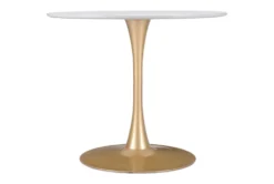 The Opera White And Gold 35 Inch Dining Table is a contemporary piece that is perfect for small spaces. With a pedestal design and narrow shape, this table is made of painted MDF and steel, and requires assembly.