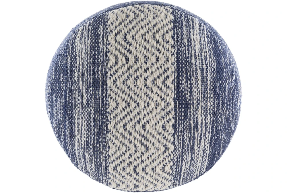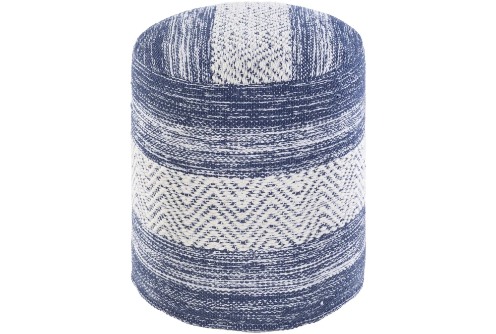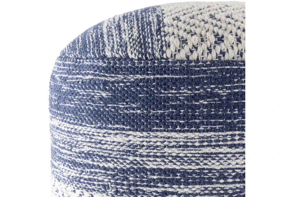 This Pouf-Blue Denim White Stripe is a traditional style product made of 80% cotton and 20% PET fiber, with 100% polybeads and 100% cotton secondary material, featuring a blue denim white stripe color scheme. Its other properties include beige, denim, white, and cream accents.