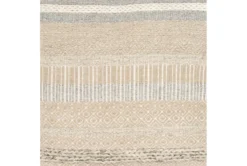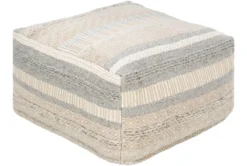 This traditional style pouf is made of fiber and cotton in a grey beige stripe design. Other properties include medium gray, ivory, and beige colors, as well as a material composition of 65% cotton, 27% wool, 8% viscose, 100% polybeads, and 100% cotton.