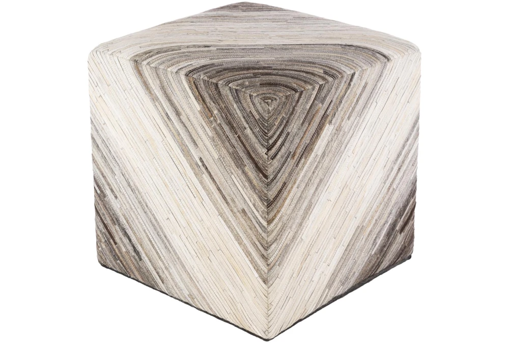 This rustic Pouf is made of grey white hair on hide fiber. It comes in various colors including ivory, beige, khaki, taupe, medium gray, and tan. The Pouf is made of 100% hair on hide, 100% polystyrene block, wood, and 100% wool.