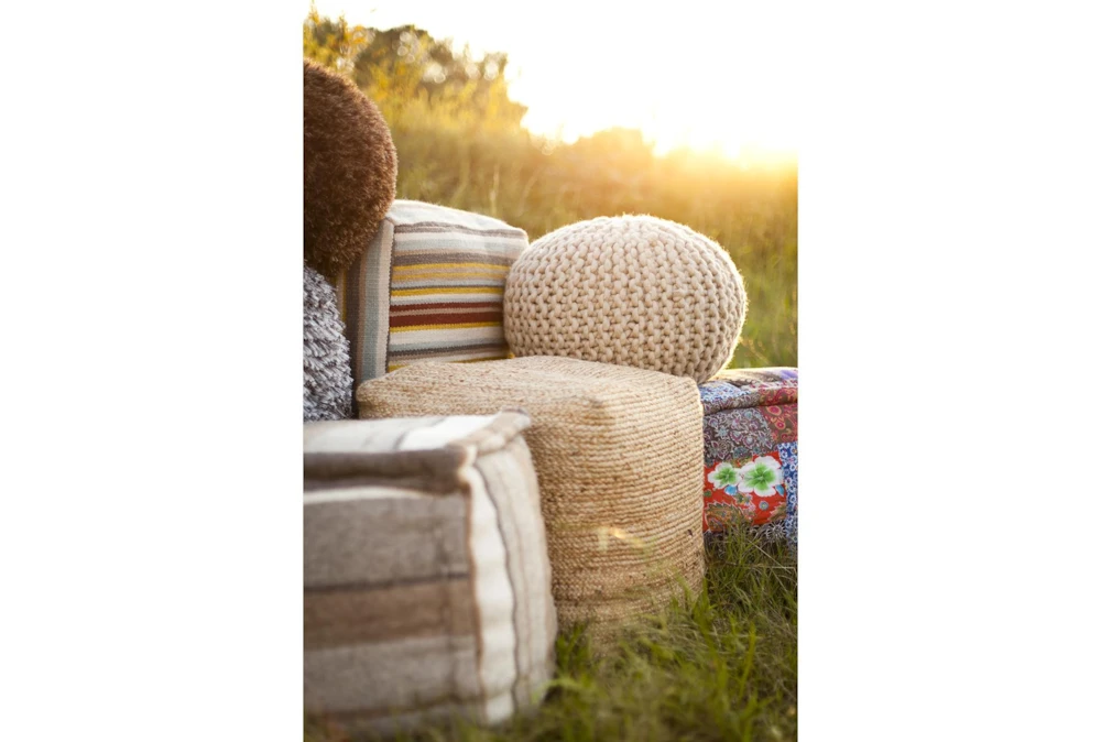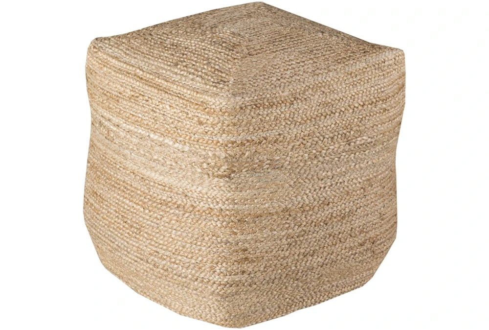 This product is a traditional-style Pouf made of natural fiber material with a braided Jute design and a tan color. The Pouf is made of 100% Jute, 100% Polyester/Polyfill, and 100% Cotton, and features a secondary material of Jute and Cotton.