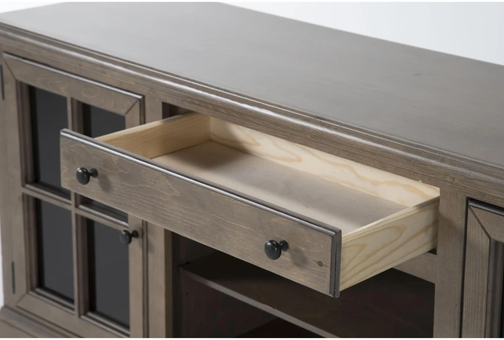 If your TV is your everything, our Preston console is the perfect place to showcase it. Thanks to the natural beauty, strength and quality of solid ponderosa pine, this design will be a sophisticated, sturdy addition to your living room. A timeless, versatile grey finish highlights the wood’s authentic characteristics, and enriches the molding and panel details.