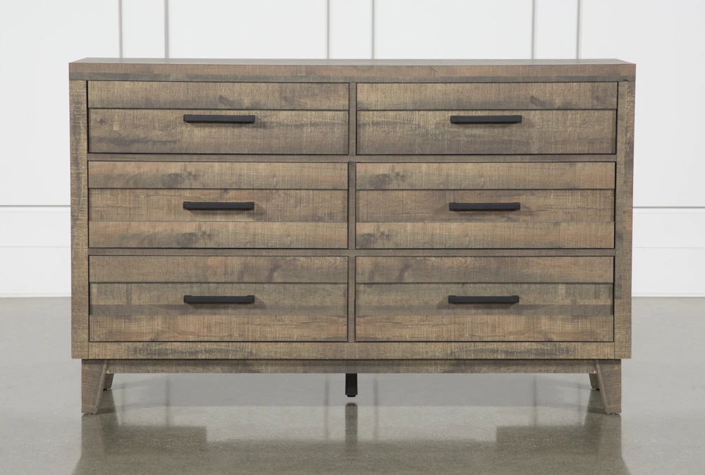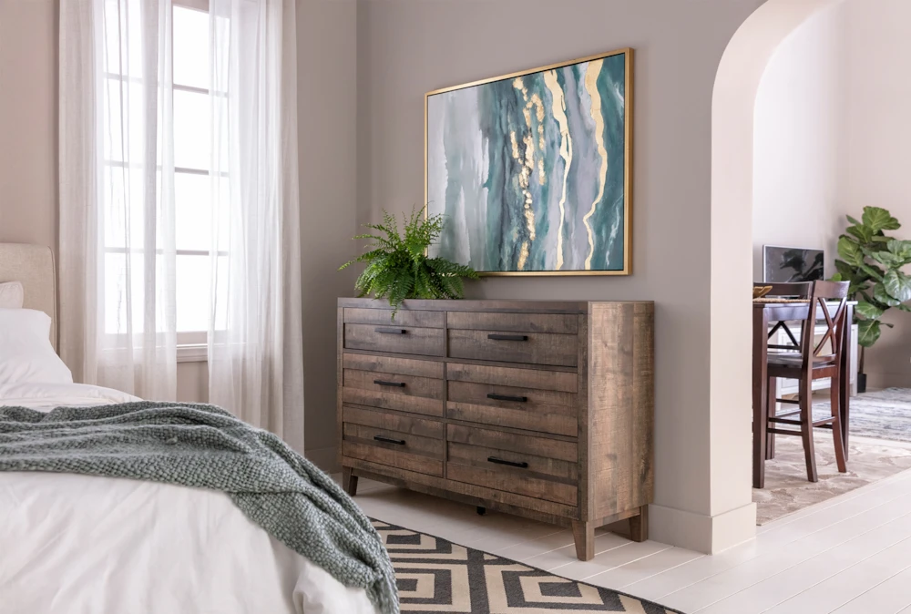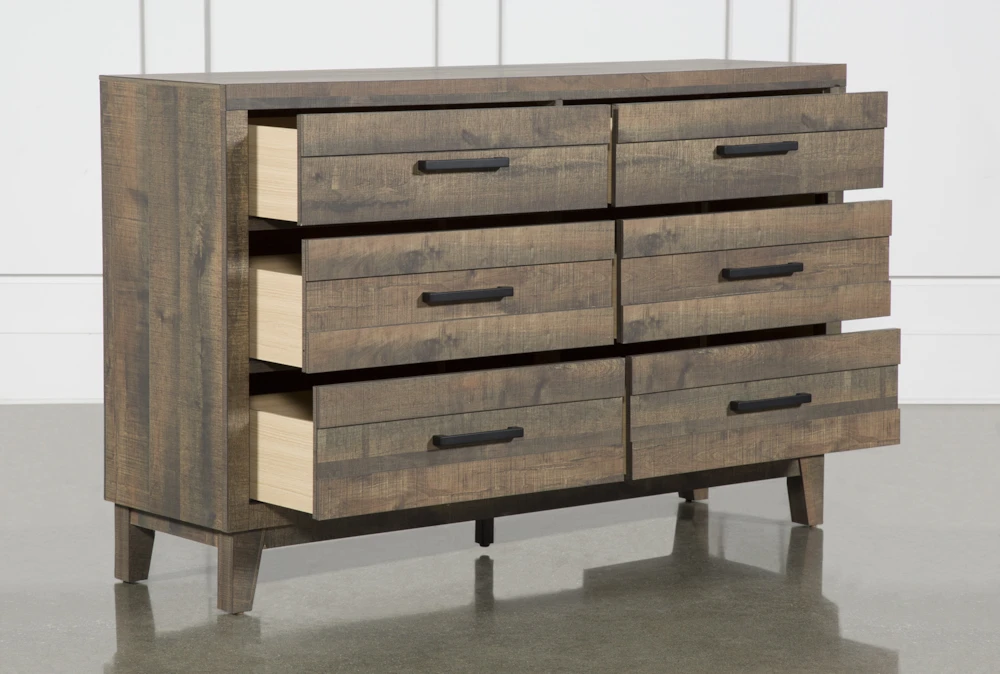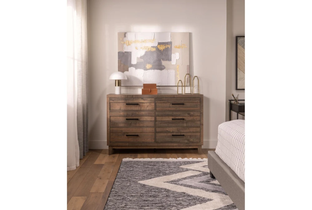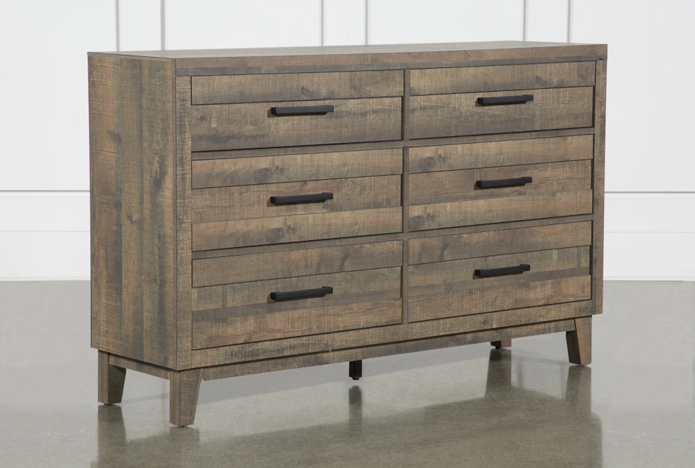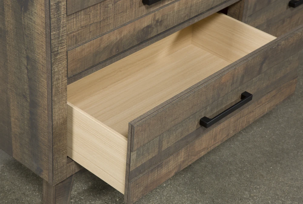 Wake up in a modern rustic retreat with the Ranier dresser. Constructed from composite wood-look materials, Ranier shines with a laminate mahogany finish that mimics the grooves and dimension of real wood grain. Style this piece with the rest of the collection to get a nature-made bedroom aesthetic at an amazing value.