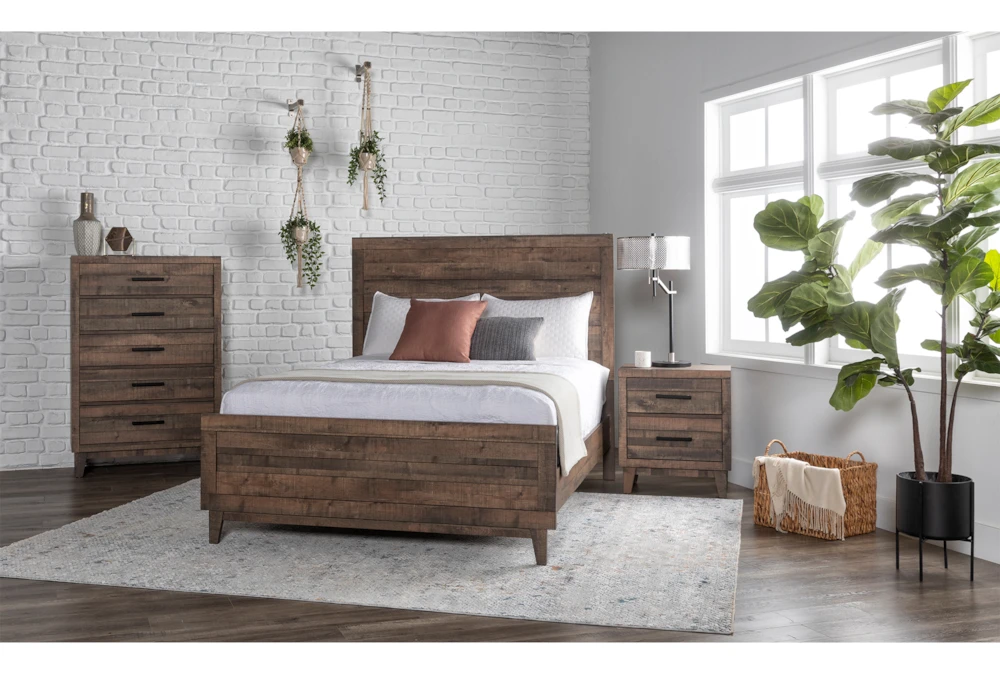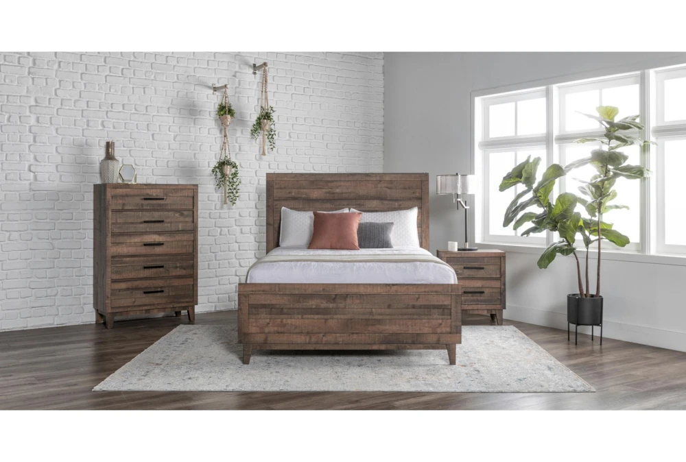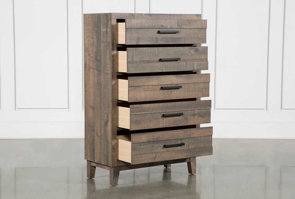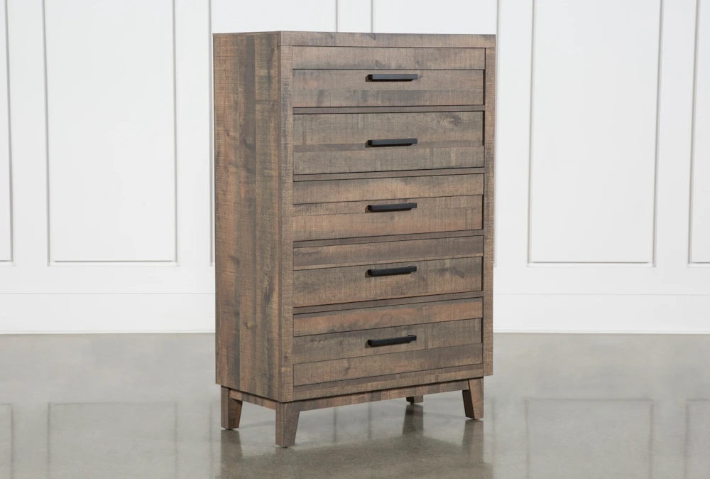 Wake up in a modern rustic retreat with the Ranier chest of drawers. Constructed from composite wood-look materials, Ranier shines with a laminate mahogany finish that mimics the grooves and dimension of real wood grain. Style this piece with the rest of the collection to get a nature-made bedroom aesthetic at an amazing value.