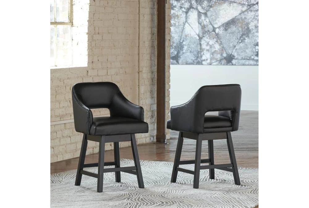 Elevate your dining area with this set of two Remy Black Upholstered Swivel 25 Inch Counter Stools. With a modern style and tall, armrest-backed design, these stools are crafted from multi-media materials in a rich brown color, and feature a convenient swivel function for easy maneuvering. Assembly is required, and UPS parcel shipping ensures a safe delivery.