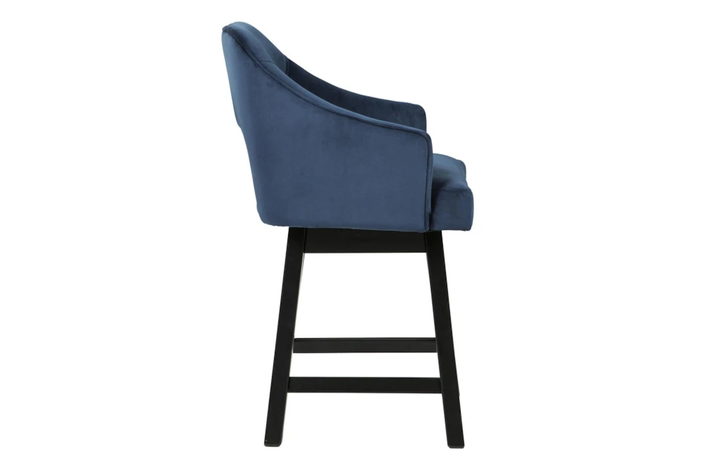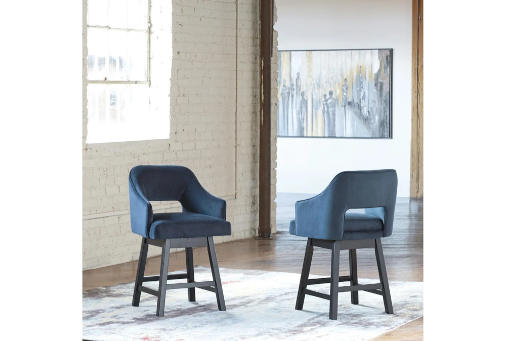This set of 2 Remy Blue Upholstered Swivel 25 Inch Counter Stools features a modern style and tall design with arms and a swivel function, perfect for any dining room. The stools are upholstered in a blue/dk brown faux leather and fabric/wood material with an upholstered back and seat, requiring some assembly.