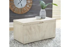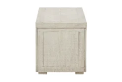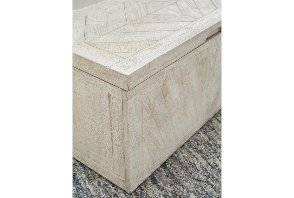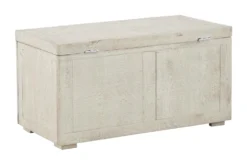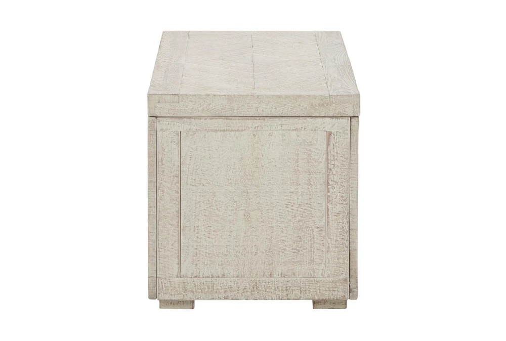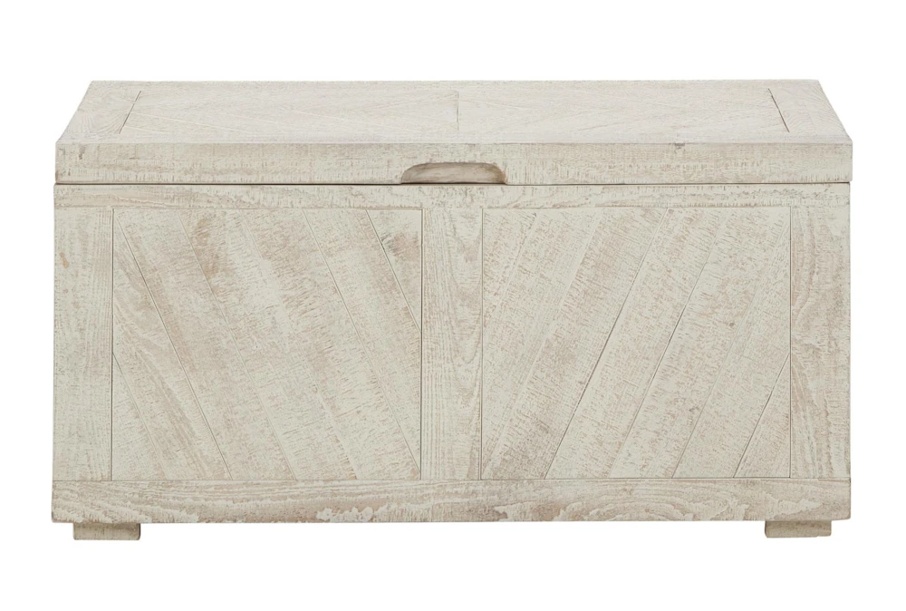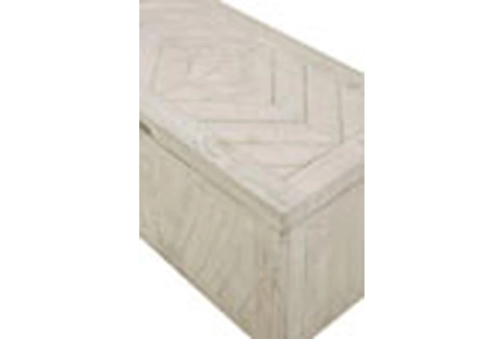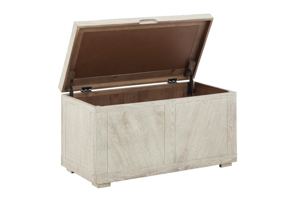 Made of solid and engineered wood in a distressed white finish. Diamond pattern on top. Hinged top with storage.
