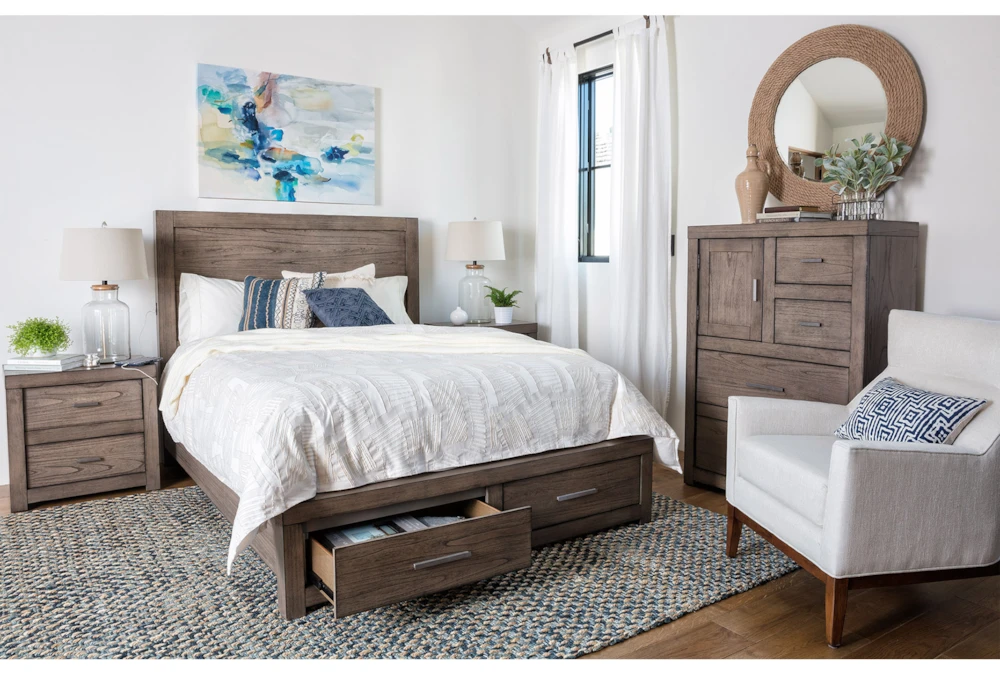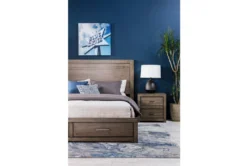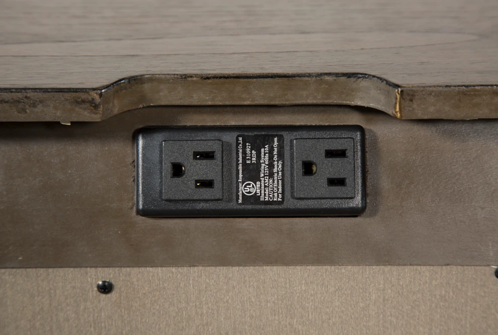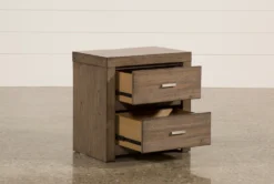 Our Riley nightstand will add plenty of character and order to your bedroom. Crafted of hardwood and veneer, the handsome, streamlined piece features a greystone finish, zinc hardware and 2 power outlets that you can use for a lamp and other electronics.