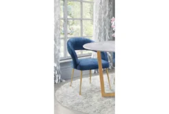 The Rishi Navy Dining Chair is a modern style chair made of fabric and metal, perfect for any dining room. Handmade by skilled craftsmen, it features comfortable velvet upholstery in a variety of colors and brushed gold stainless steel legs.