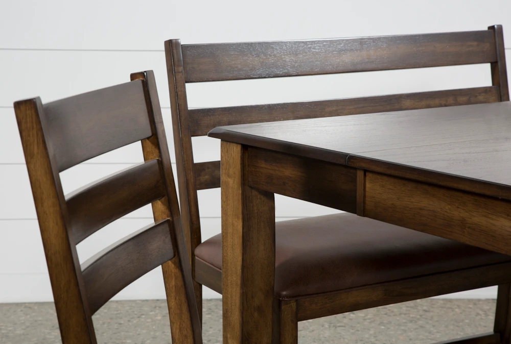 The Rory 6-piece counter set takes inspiration from bygone city lounges paired with contemporary elements for a look that’s just as approachable as it is stylish. The premium hardwood and elm veneer construction is enriched by a multistep tobacco finish, while upholstered leather-look seats bring a ritzy edge to the mix. Rory features tapered legs, ladder back stools and bench, and an 18” extension leaf so you can expand your guest list.