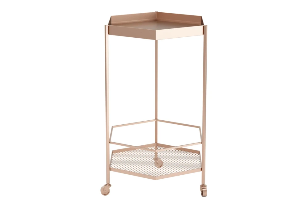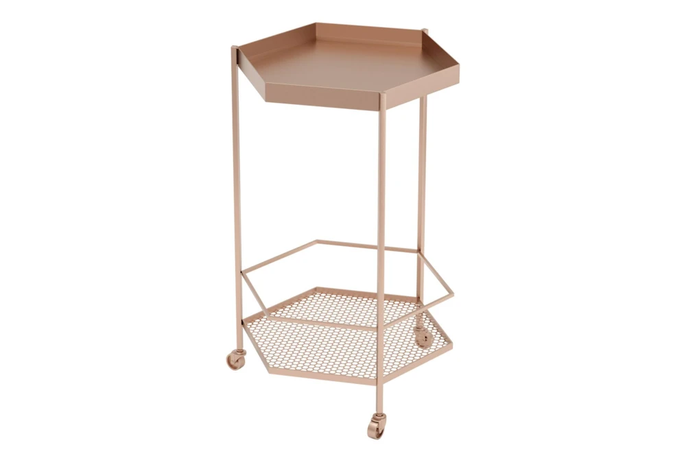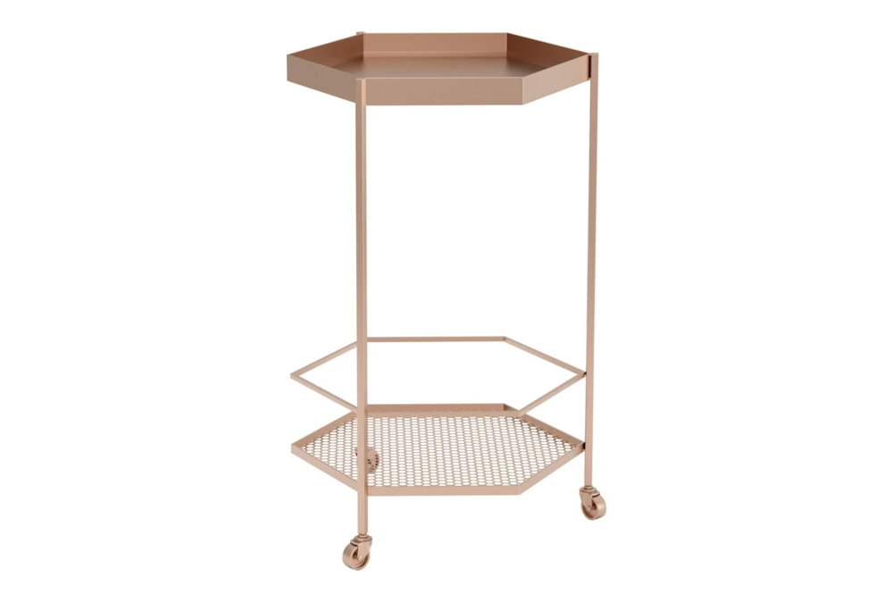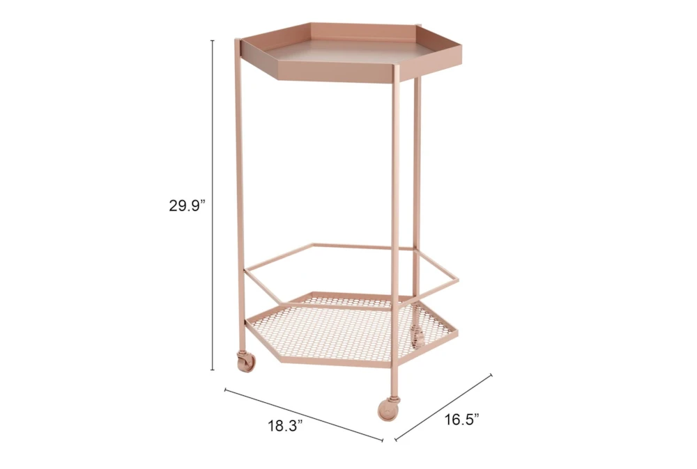 This Rose Gold Hexagon Bar Cart is a modern addition to any dining room, with its sleek metal construction and painted steel finish. The cart features two tiers for storage, casters for easy rolling, and can support up to 285 lbs.