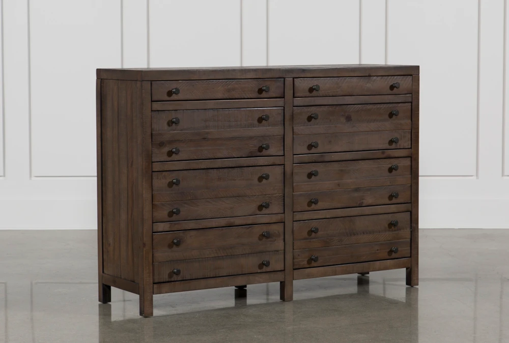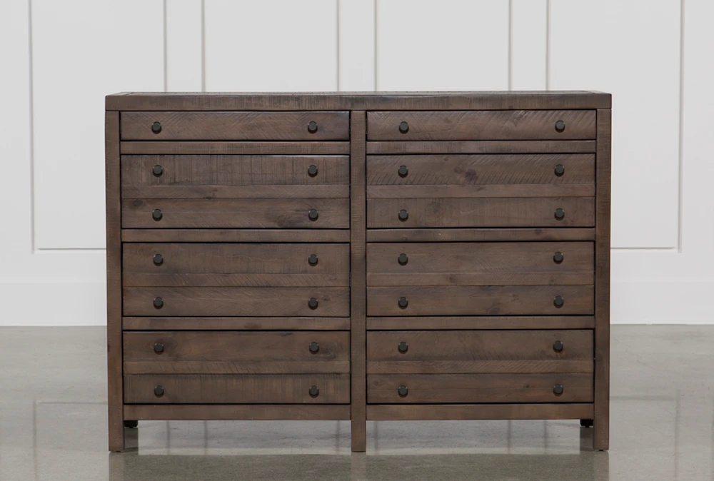 Vintage printmaker’s cabinets are the inspiration behind our handsome eight-drawer Rowan dresser. Rough-hewn solid pine construction, charming planked detail and rustic bronze hardware instill heirloom character. Uniquely designed drawers like the kind used for organizing maps, plans and blueprints have been reimagined for bedroom use. The two narrow top drawers include felt-lined inserts that provide a soft spot for jewelry.