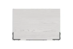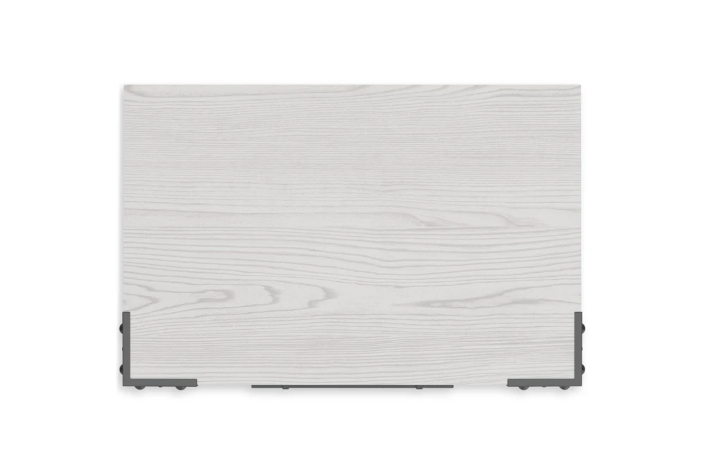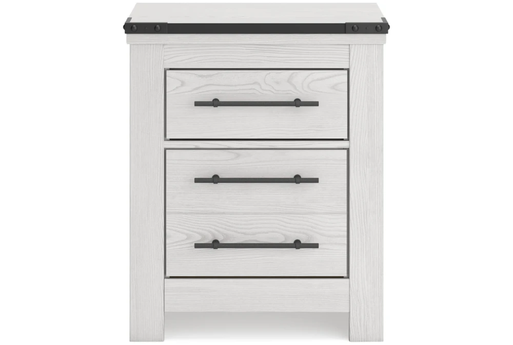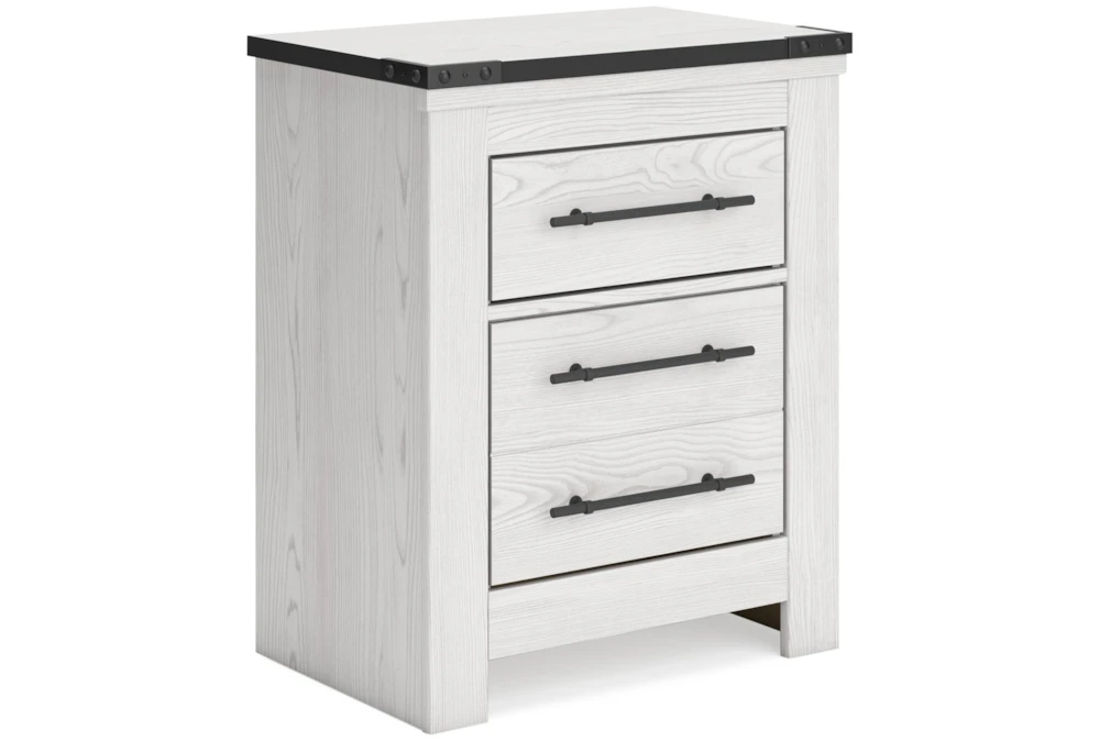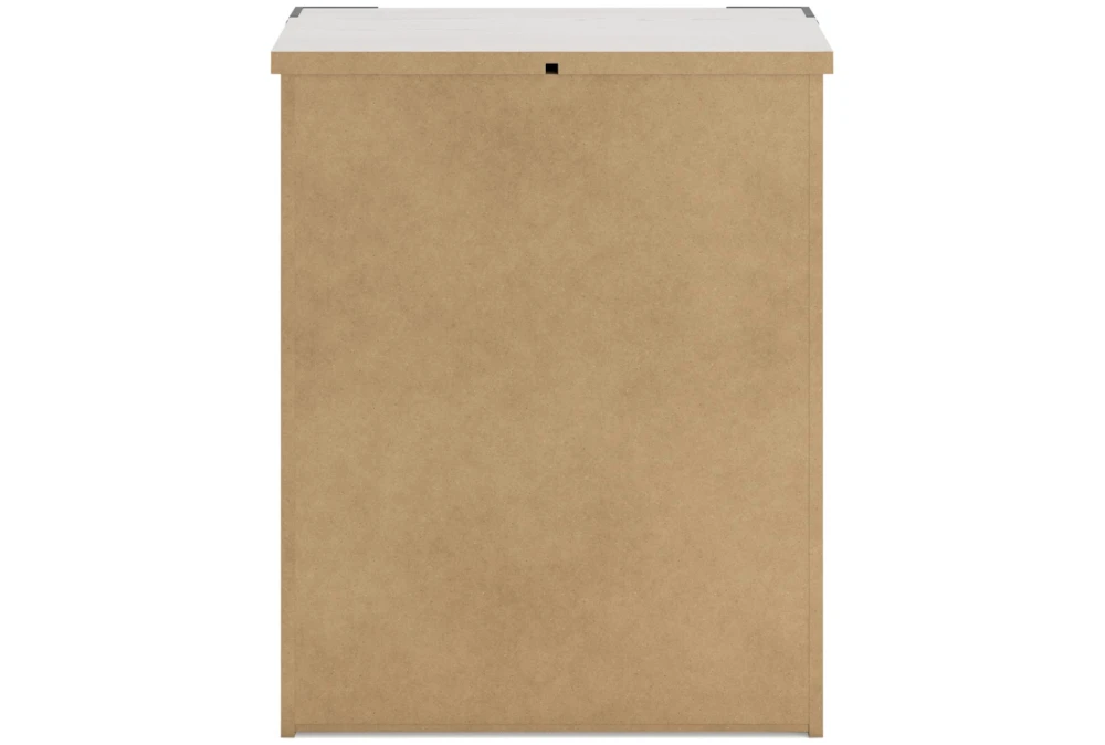 Made of engineered wood and decorative laminate. White rustic finish. Replicated cedar grain. Top edges with faux metal banding and nailhead trimmed corner pieces. Dark pewter tone handles. 2 smooth-gliding drawers. Drawer interiors lined with faux linen laminate. Framed front and pilasters. Wireless and USB charging options.
