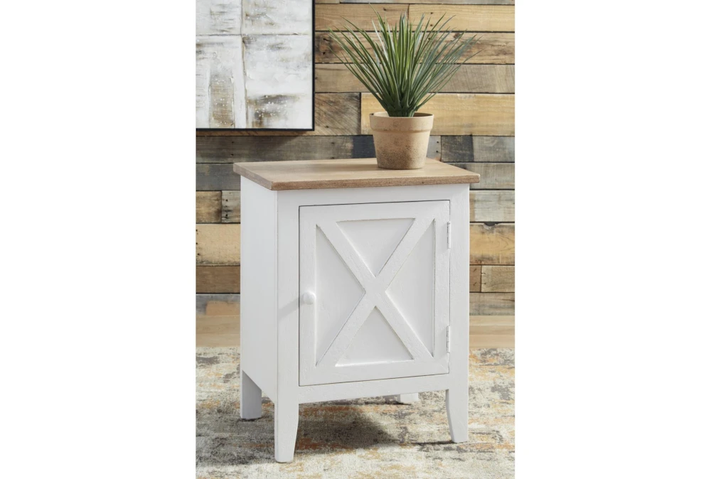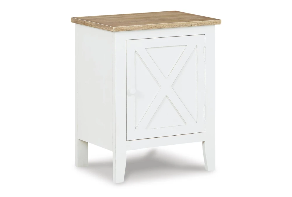 Made of solid and engineered wood in brown and cream finishes. Crossbuck door front. Wood door pull. 1 door and 1 shelf.