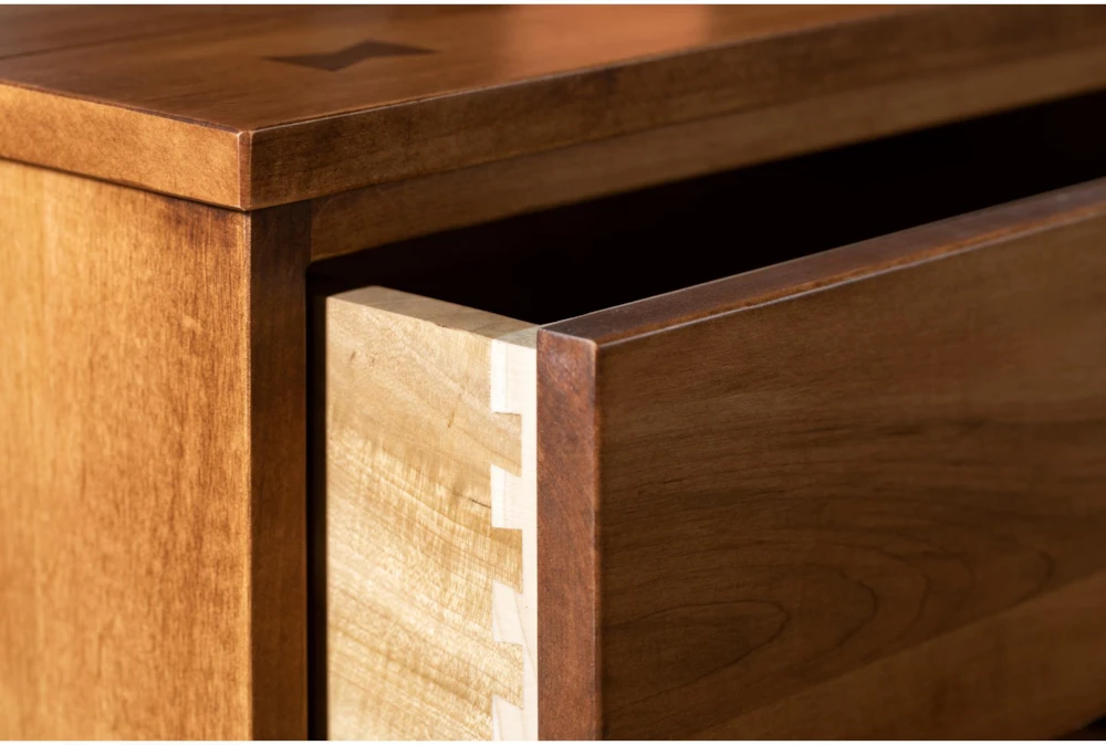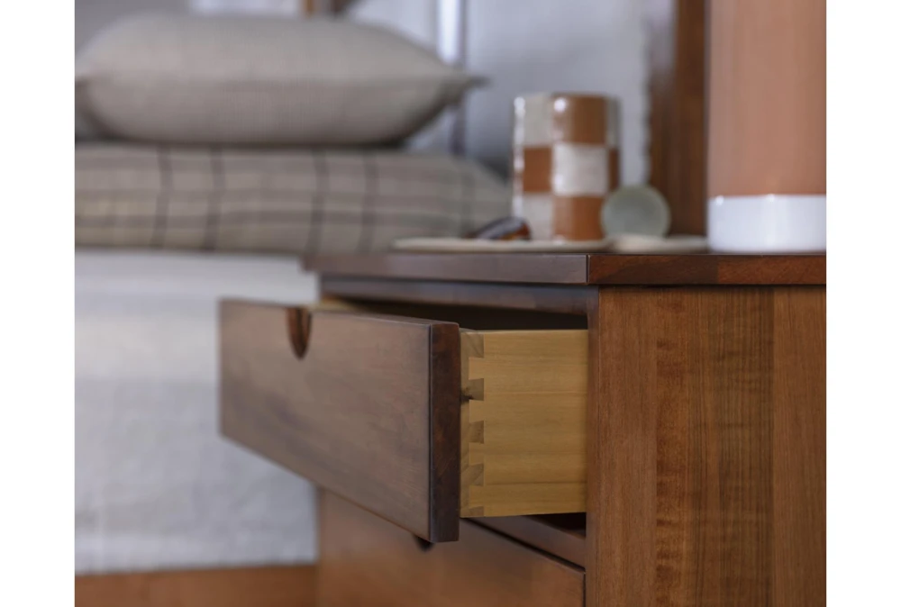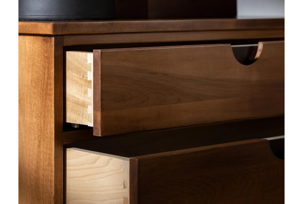 Transform your space into an escape from the everyday with the dreamy Serenity bedroom collection from our American-Crafted solid wood furniture line. Brown maple is the center of attention and source of inspiration for each hand-built piece – all of which are made by Amish woodworkers who bring years of experience and expertise to the thoughtful execution of all details. In fact, they mark each item with their signature. The headboard’s nailhead-trimmed upholstered panels and the drawers’ recessed handles bring distinctive style, while dovetailed solid wood drawers, mortise and tenon joinery and full-extension ball-bearing guides ensure quality performance. Choose from multiple alluring finishes and get the color and character just right for your retreat.
