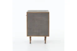 The Shagreen Bedside Table in Antique Brass features drawers and handles, and is made of modern resin material in a stylish grey color designed for the bedroom. This table requires assembly, is perfect for small spaces, and is made of a combination of iron and resin for durability and long-lasting use.
