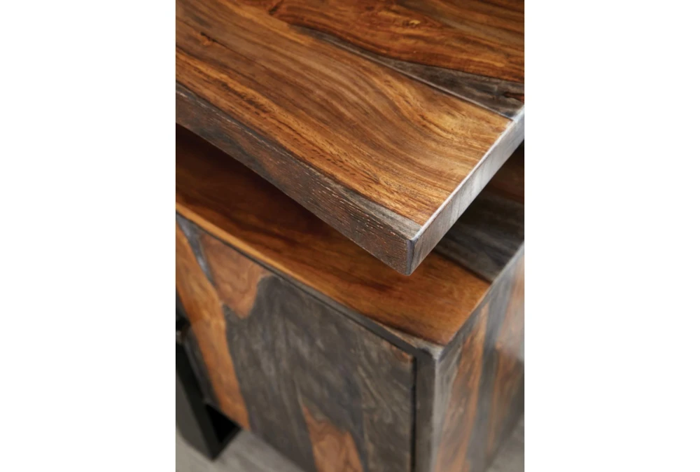 - Rustic style with a grey Sheesham color and black metal knob hardware