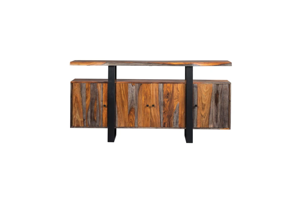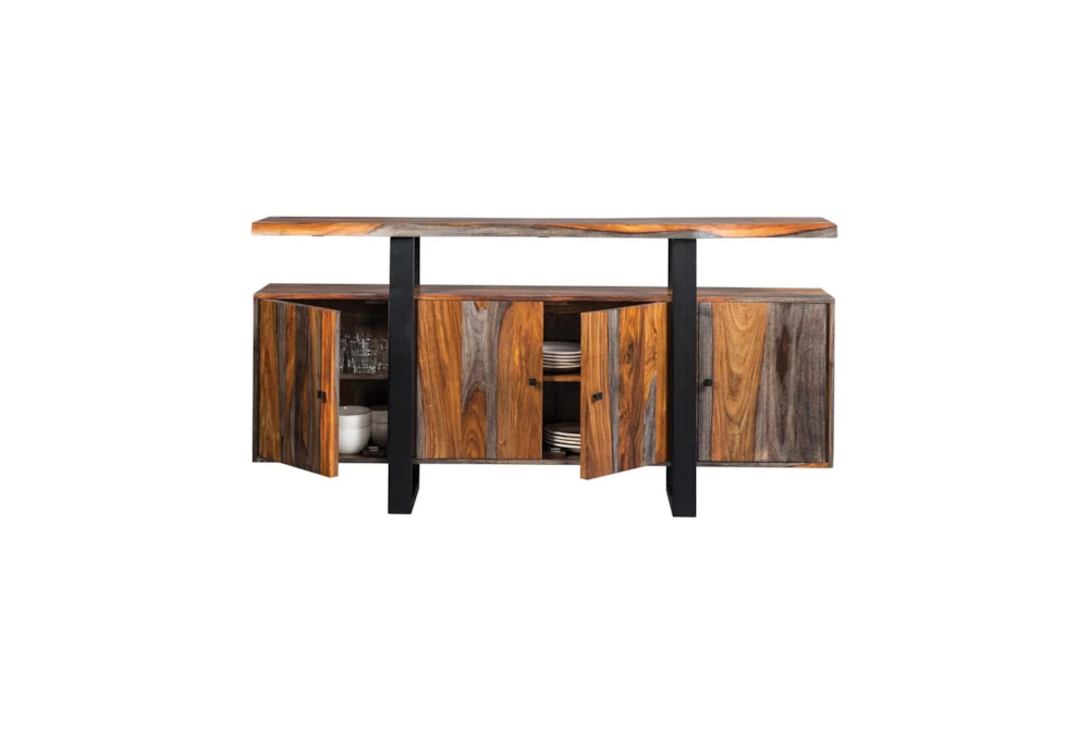 The Simpson Server is a rustic style server made of wood and metal, with storage, shelves, and doors to keep your dining room organized. Its grey Sheesham color and black metal knob hardware add a touch of elegance to its functional design.