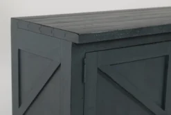 A casually distressed finish gives the Sinclair TV stand its charming weathered texture and reveals the natural beauty of a streamlined solid pine design. Calming in blue, the piece is adorned with understated pewter hardware.