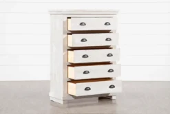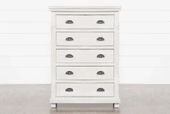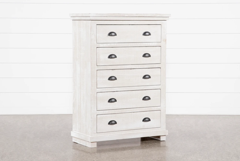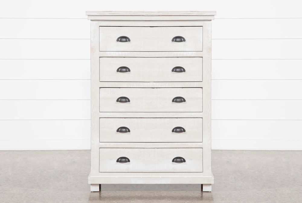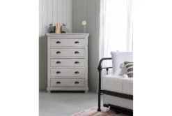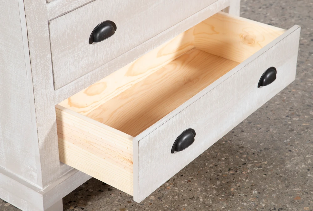 Let natural beauty take over your space with our Sinclair Pebble chest. Constructed with salvaged solid pine, the design is rough hewn and planed to showcase the wood’s unique characteristics. Then, the wood is decked in a grey chalk finish with hand-applied distressing for a weathered look. To ensure maximum durability, it incorporates tongue and groove construction, solid pine drawer interiors and metal guides. Vintage-inspired bin pulls in a gunmetal finish are an extra special touch you’ll love.