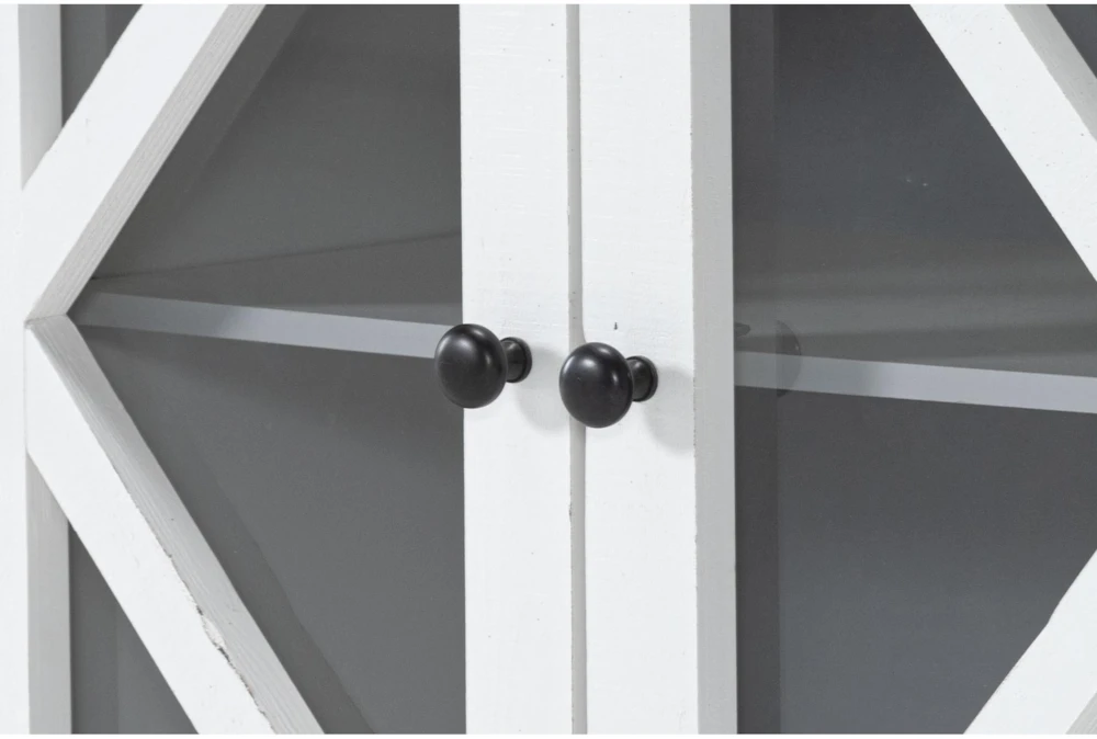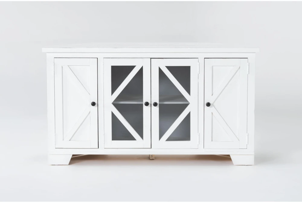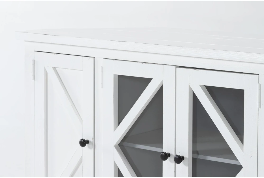 A casually distressed finish gives the Sinclair corner TV stand its charming weathered texture and reveals the natural beauty of a streamlined solid pine design. Ethereal in white, the piece is adorned with understated pewter hardware.
