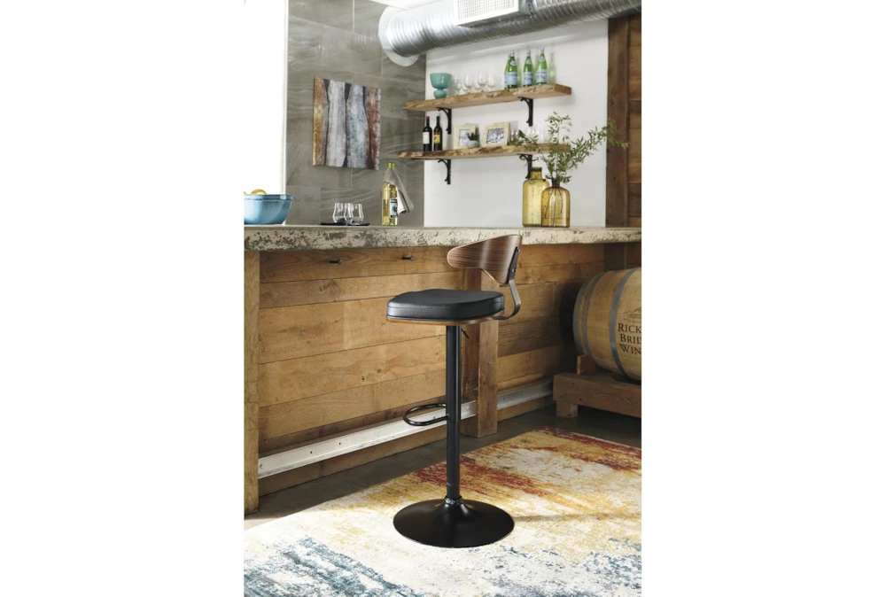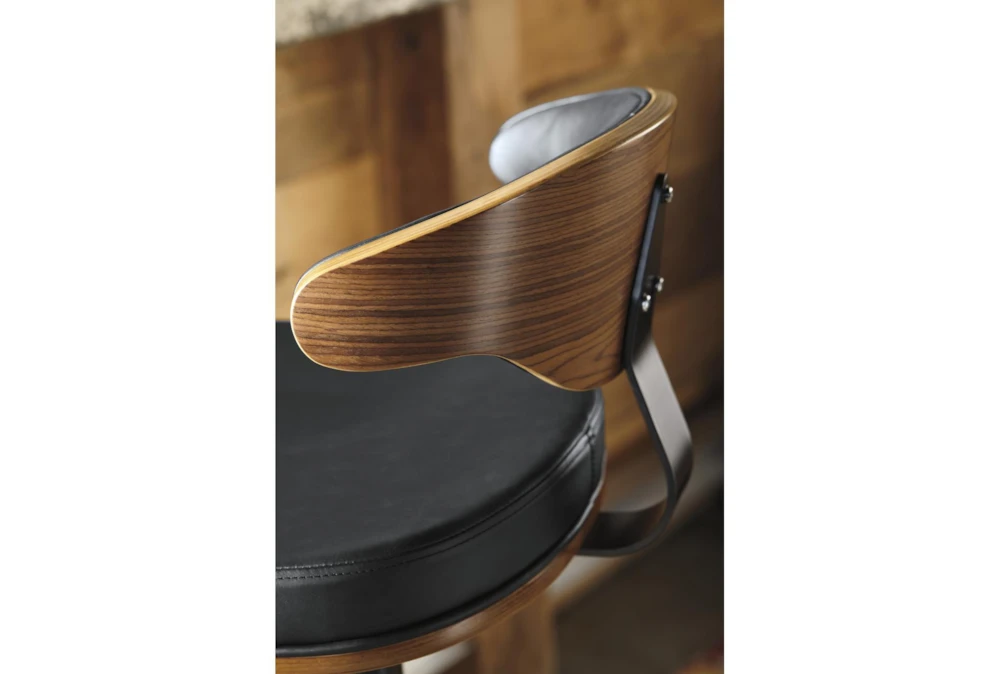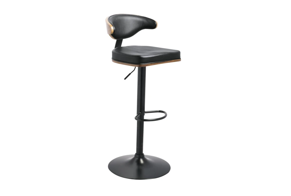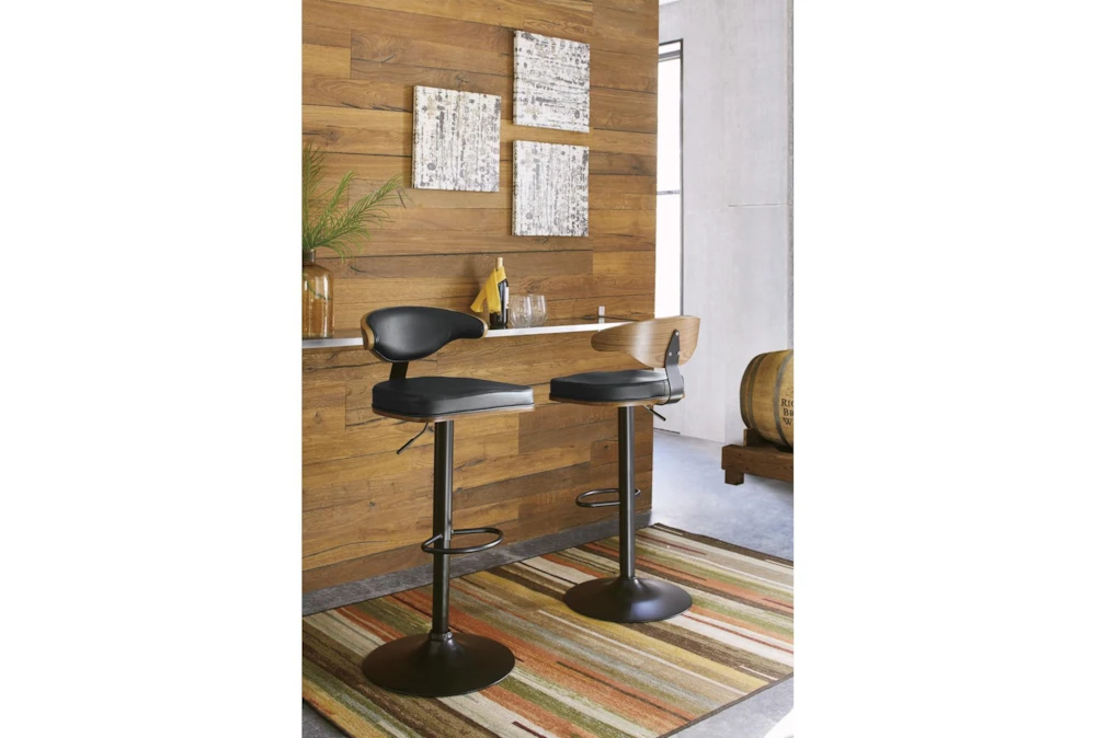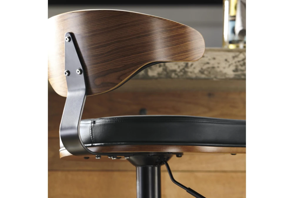 Stool frames made with tubular steel and have weighted pedestal base and adjustable height to move from counter to bar function. Stools have footrest and upholstered seats.D120-330 stool frame has a black finish and a dark brown faux leather upholstered contoured seat and back that is accented with plywood in a brown finish.
