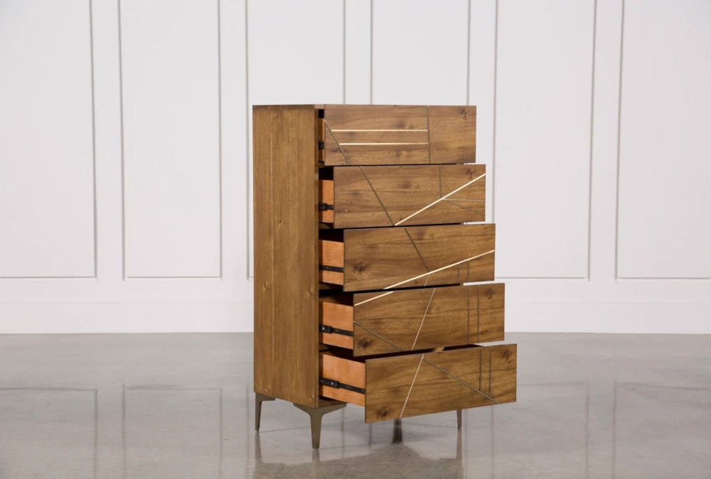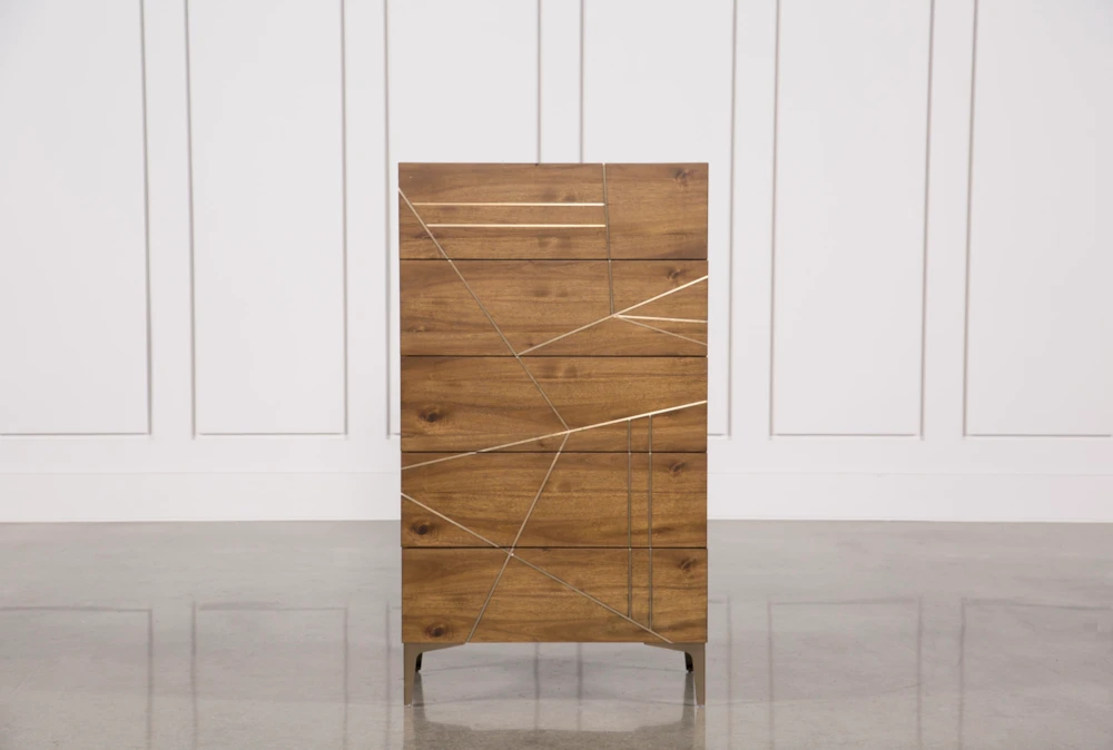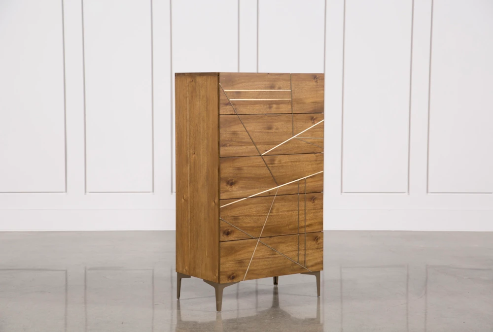 With gold metal inlays in an abstract geometric pattern, our Talbert chest brings graphic flair to your bedroom. The design also boasts distinctive gold metal legs, a solid poplar frame and sturdy drawers constructed to provide secure, stylish storage. Perfect for mixing and matching with other bedroom furniture, this piece allows you to create a truly custom retreat.
