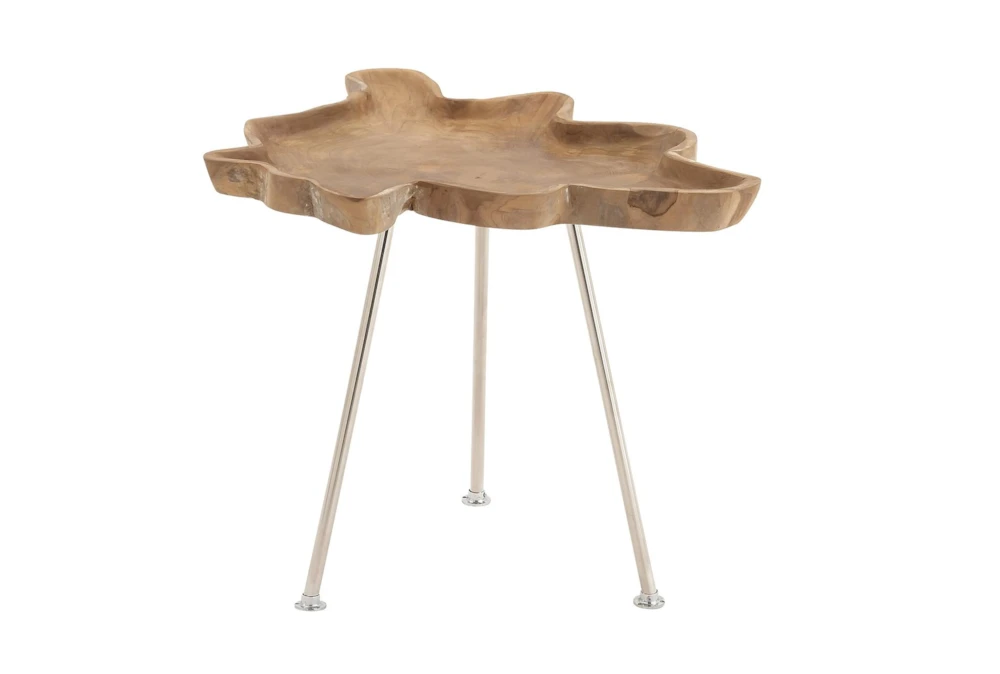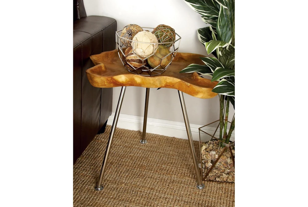 This rustic Teak Root and Metal Tray Accent Table is assembled and boasts a durable design made of teak wood and metal. The tall table features a warm brown finish with silver legs and a raised edge with gentle curves for a remarkable form on tripod legs.