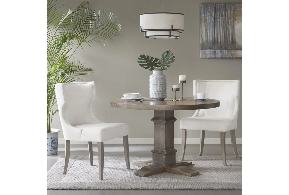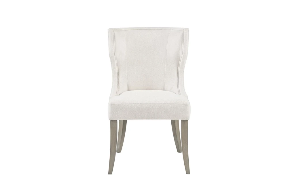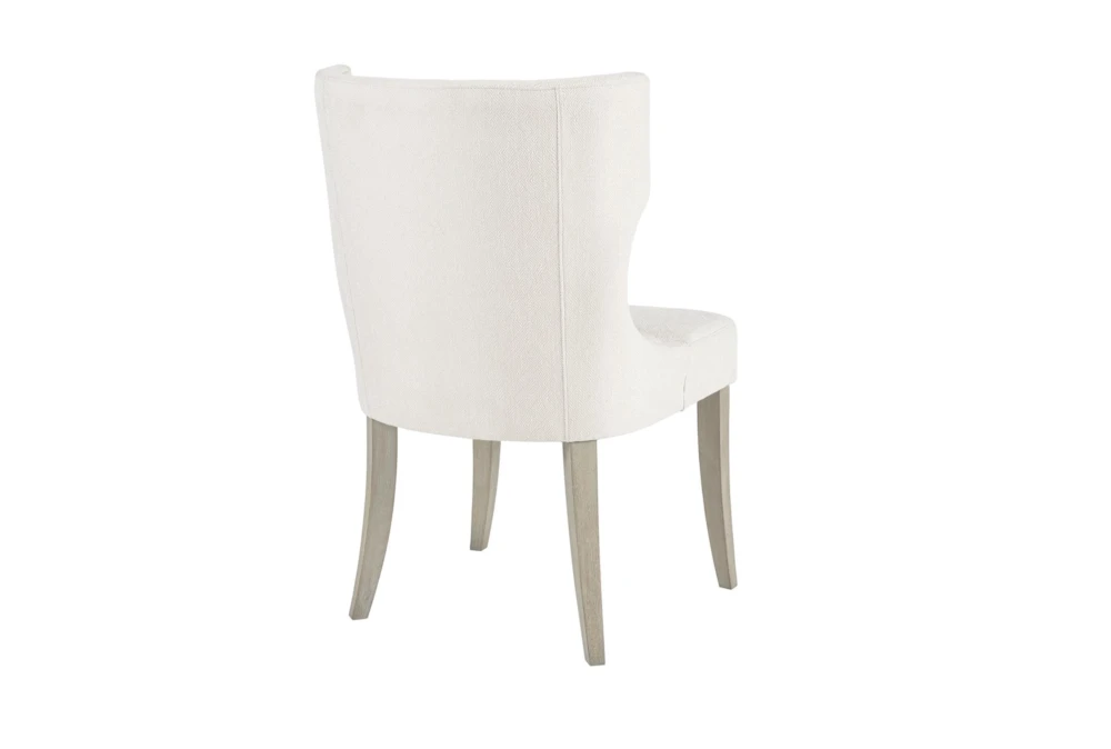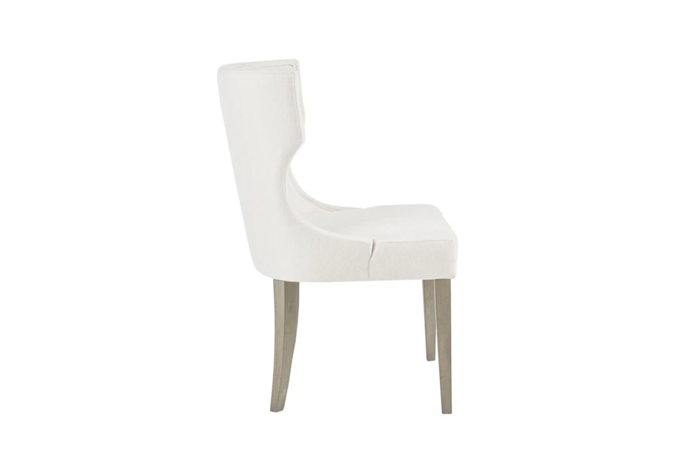 The Theodore Dining Side Chair is a casual style chair made of wood, with a natural color and upholstered seat and back. Assembly is required and the chair features rubber wood legs, a cream color, a 100% polyester fabric, high density foam filling, and a reclaimed grey smooth wood finish.