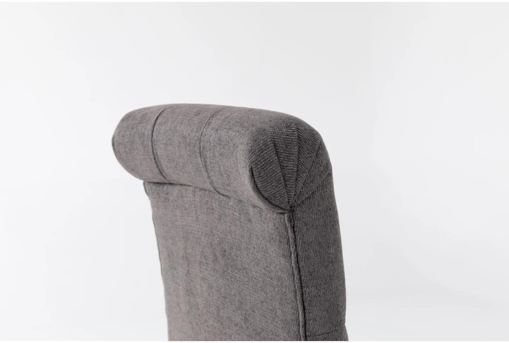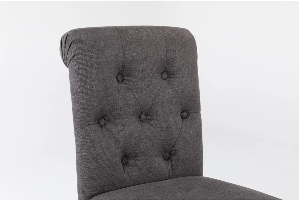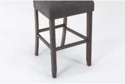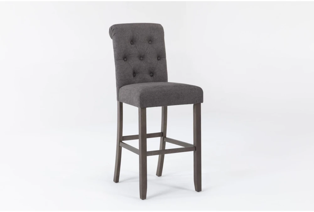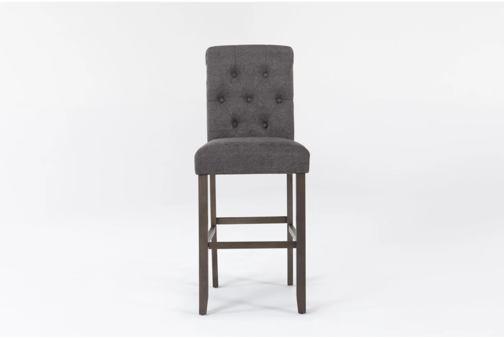The Tobias Tufted Back Bar Stool Set in Grey & Rustic Brown is a traditional style, made of Asian hardwood materials, and includes two stools with assembly required. Its small space design features a grey and rustic brown color scheme, and the seat dimensions are 29.5″H x 16.5″D.