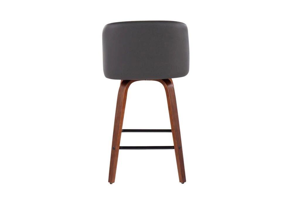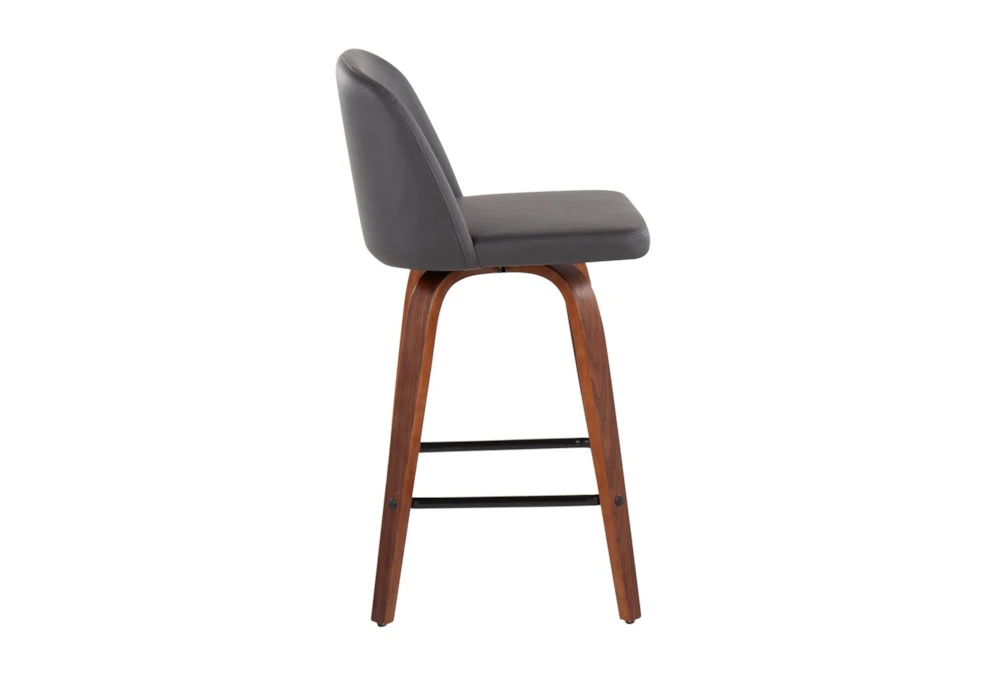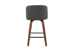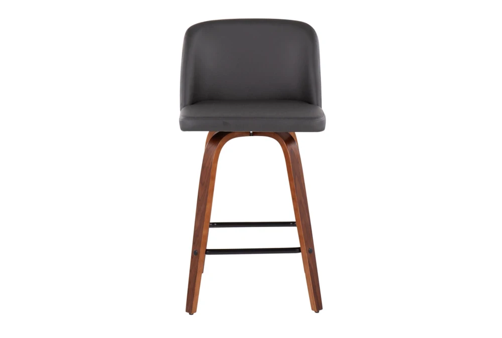 These Tori counter stools come in a set of 2 and feature a modern style with a walnut wood secondary material and grey faux leather upholstery. The stools have a fixed counter height with 360-degree swivel and a square built-in footrest with black finish. Assembly is required.